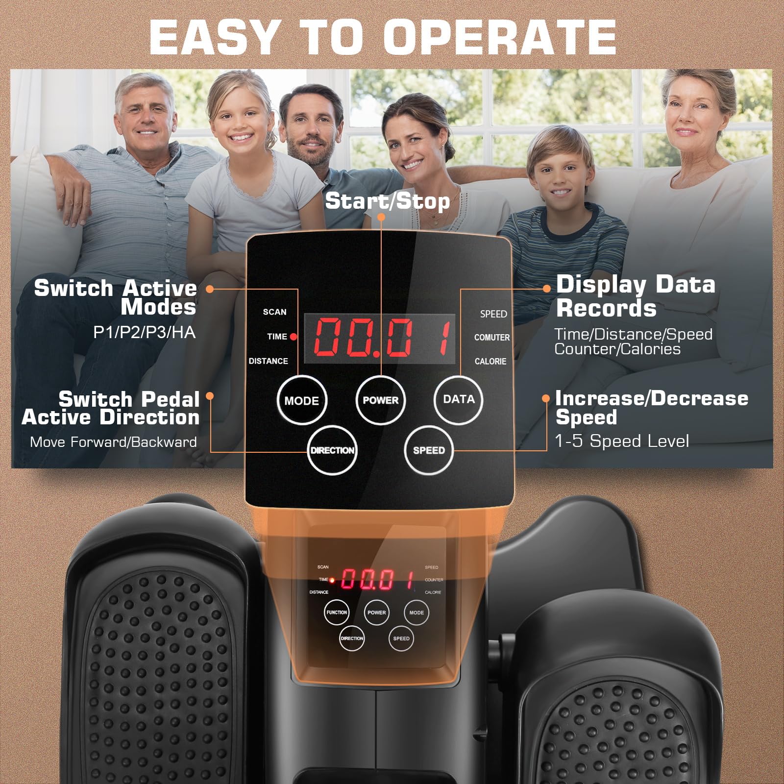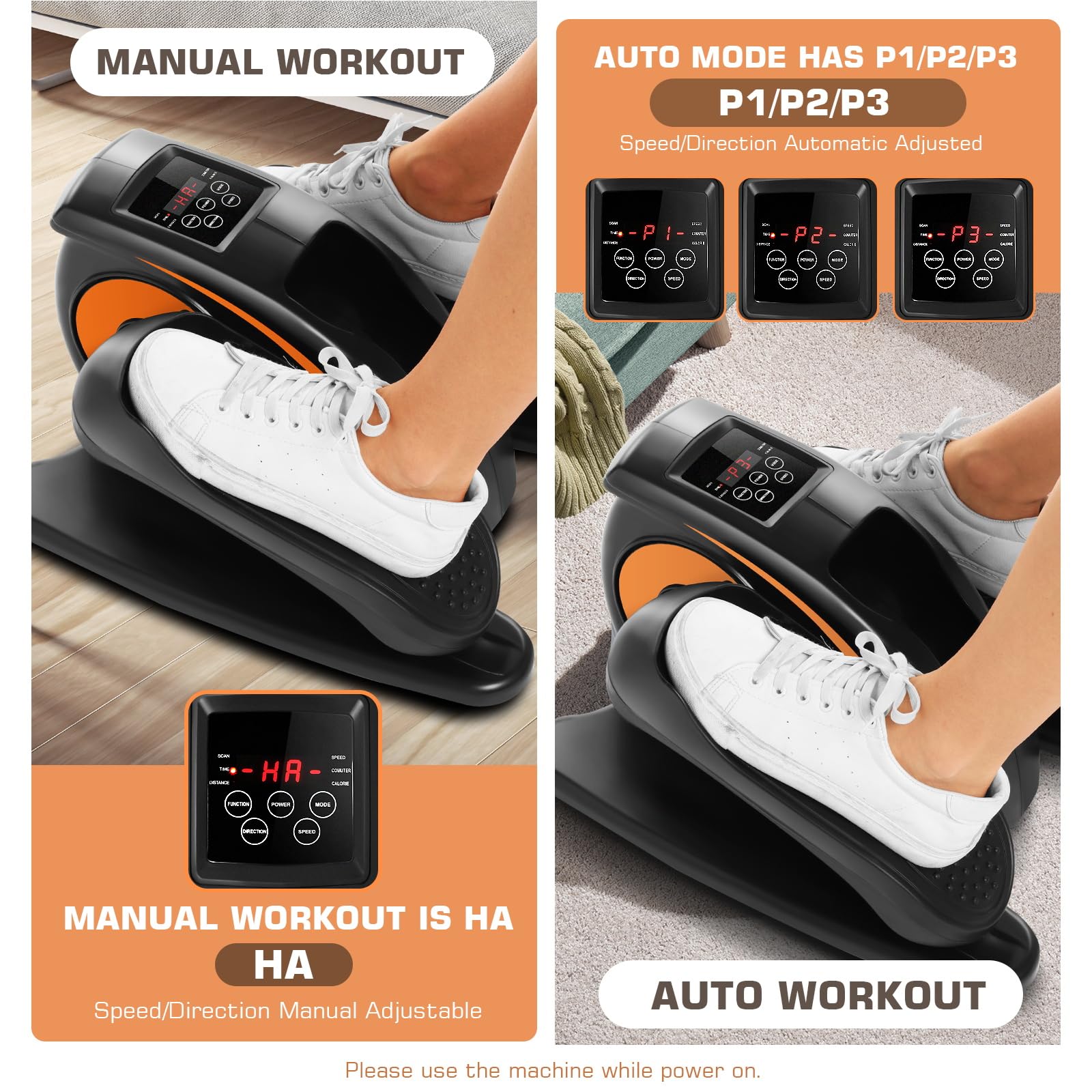 - ★【Multiple Movement Function】Depending on your needs and abilities, under desk elliptical trainer has Auto (P1-P3) & Manual (5-levels speed) for your choice. Pedals can forward or backward to target different muscles. Note: only use it while sitting.