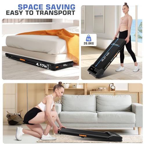 - INSTALLATION-FREE & SPACE SAVER: Our treadmill arrives with fully assembled already, you can be use straight out of the box. The mini treadmill size is 45.27*20*4.17 inches and the weight is 40 pounds, with built-in wheel design, this compact treadmill can be easily lifted and moved, allowing you to store it effortlessly under the sofa, bed, or desk when not in use, making it ideal for home, apartments and office use