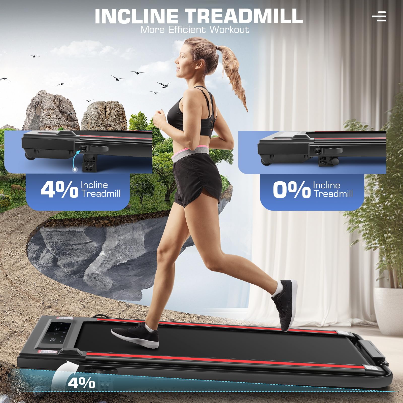 - More Efficient Workout 2-Levels Adjustable Incline: Our Compact Electric Treadmill features upgraded manual incline, offering 2 incline levels (2 and 4 degree) for a personalized workout. Experience the more effective exercise of your muscles, so that your calories will burn quickly