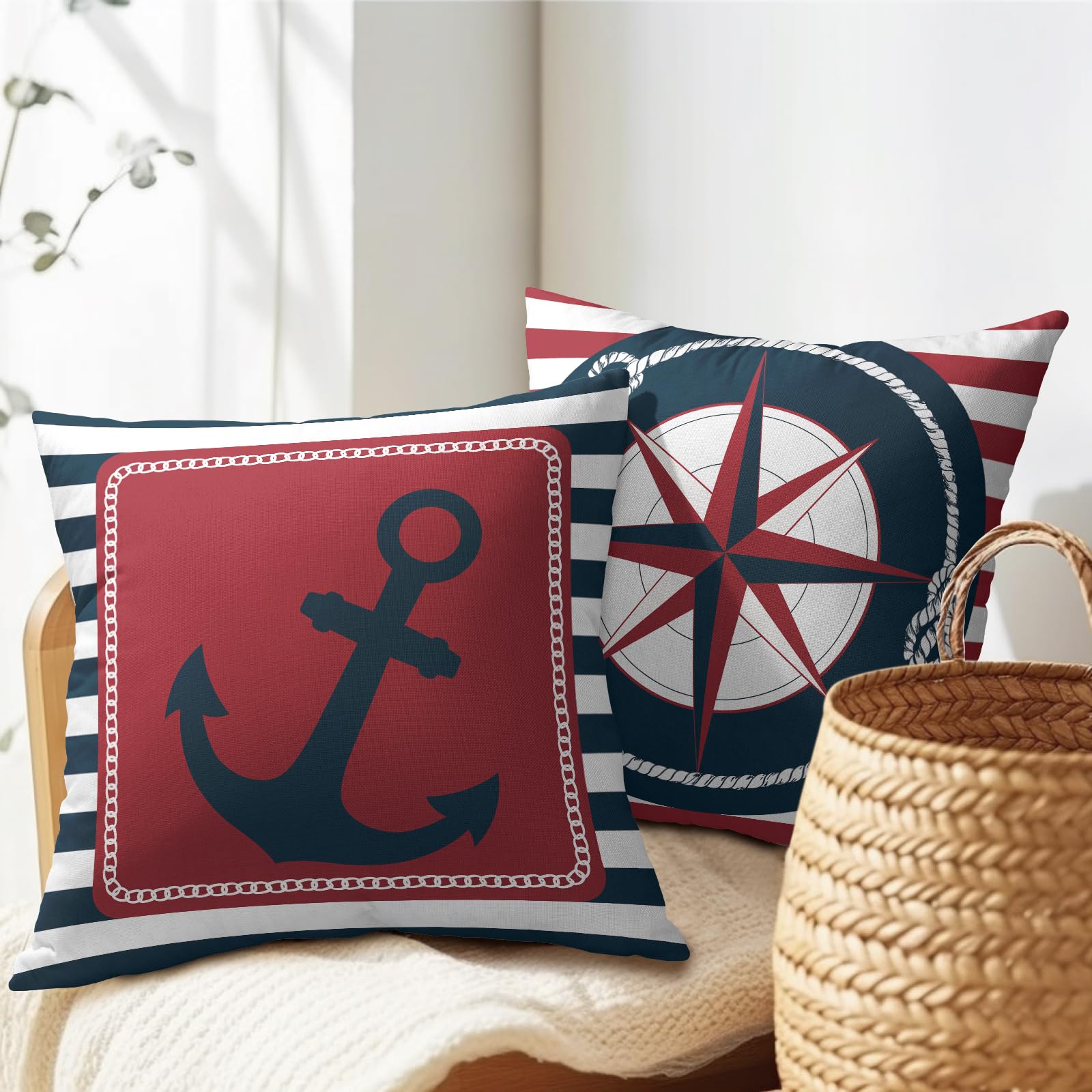 Anchor Compass Throw Pillow Cases Outdoor Nautical Pillow Covers Blue and White Stripes Decorative Cushion Cover 18x18 Inch Red and White Cotton Linen Pillowcases for Beach Coast Home Bedroom