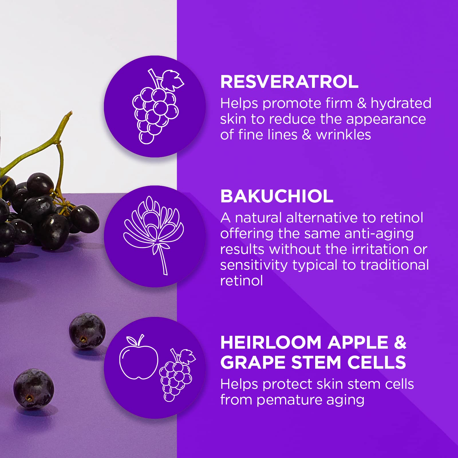 - 'Plant-Based Retinol: Resveratrol Q10 and Bakuchiol help hydrate and replenish the skin, reduce the appearance of fine lines & wrinkles, and promote a more lifted, rejuvenated complexion. '