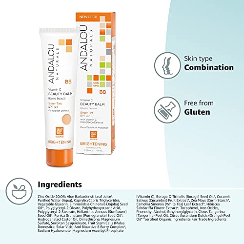 Andalou Naturals Vitamin C BB Beauty Balm Sheer Tint SPF 30, 2-in-1 BB Cream & Face Sunscreen with Broad Spectrum Protection, Mineral Sunscreen with Non-Nano Zinc Oxide, 2 Fl Oz