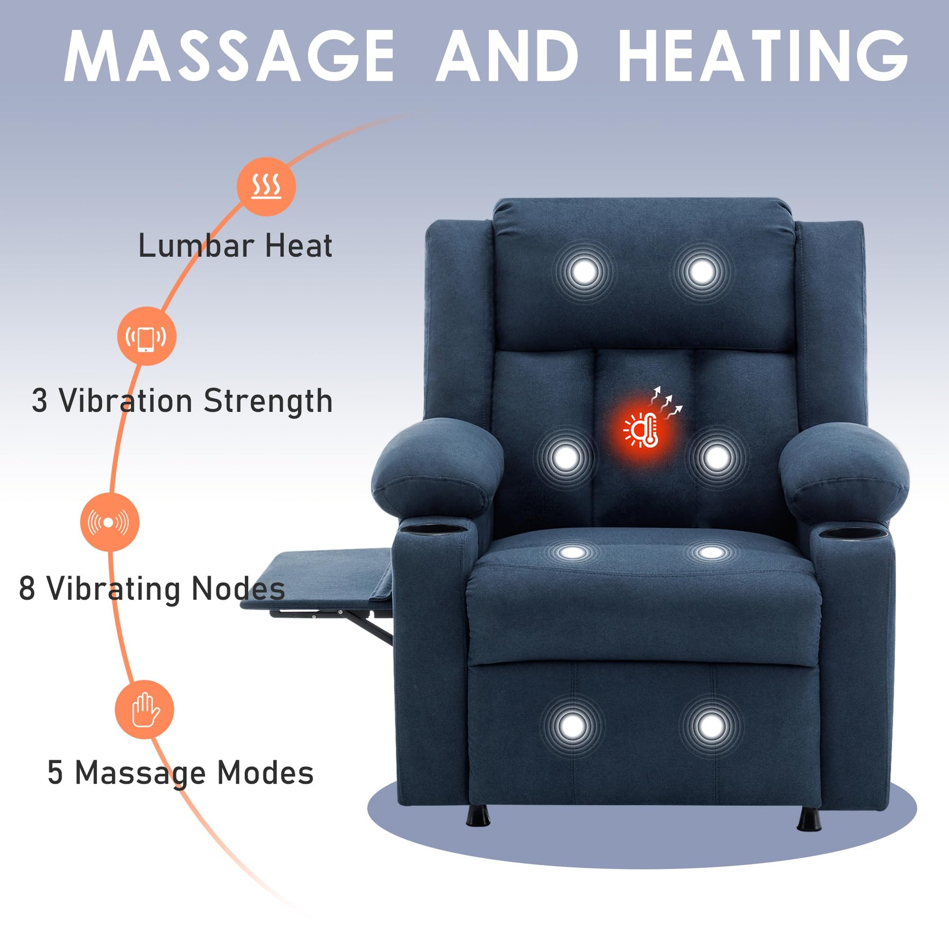 - 【Massage and Heating】This recliner features 8 vibration massage points located in the calves, thighs, waist, and shoulders, which can be controlled via remote for customized intensity to meet your unique massage needs. This Accent chair adding lumbar heating promotes blood circulation, effectively reducing fatigue and stress and enhancing your overall relaxation experience. Heat works with massage making it perfect for unwinding after a long day. NOTE:Foot rest only comes up with backrest down.