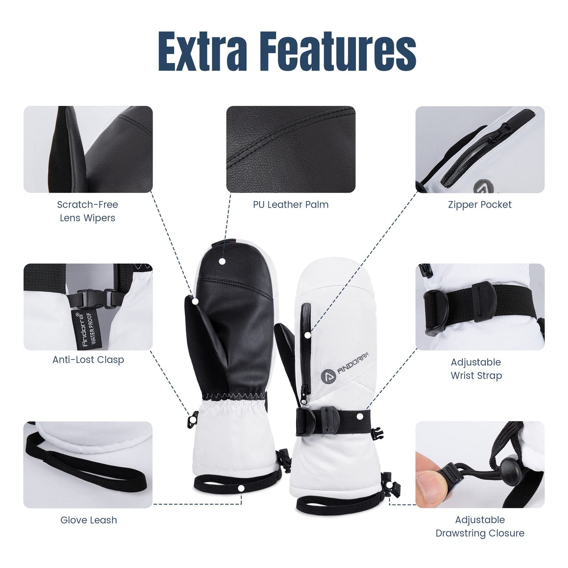 - Extra Features - Adjustable wrist strap allows you to easily put on and take off your snow mittens while keeping out snow; Anti-lost clasp helps you to store your gloves together when not in use; Backside of the thumb features a soft fabric that can be used to wipe up fogged goggles