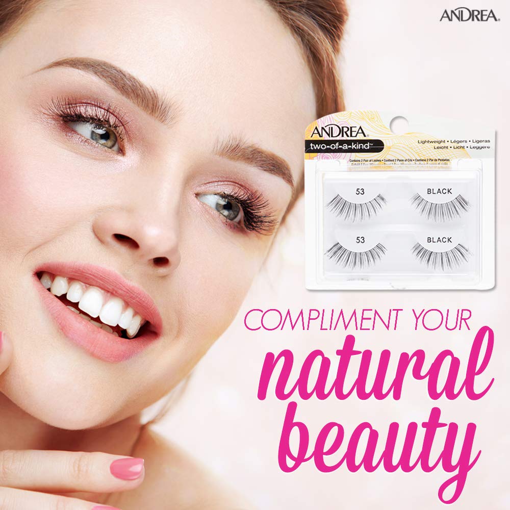 - EFFORTLESSLY ELEGANT FOR AN EVERYDAY LOOK: Intensify your peepers with the Andrea Two of a Kind False Lashes 53 Black! These falsies are a great way to enhance beauty by adding dimension to your eyes. These are the most popular lashes as they give the desired, natural look of full, beautiful lashes. These are great for wear throughout the day and to add a subtle extra flutter that will transform your eyes with a fun and flirty look. So go ahead and make an impression!