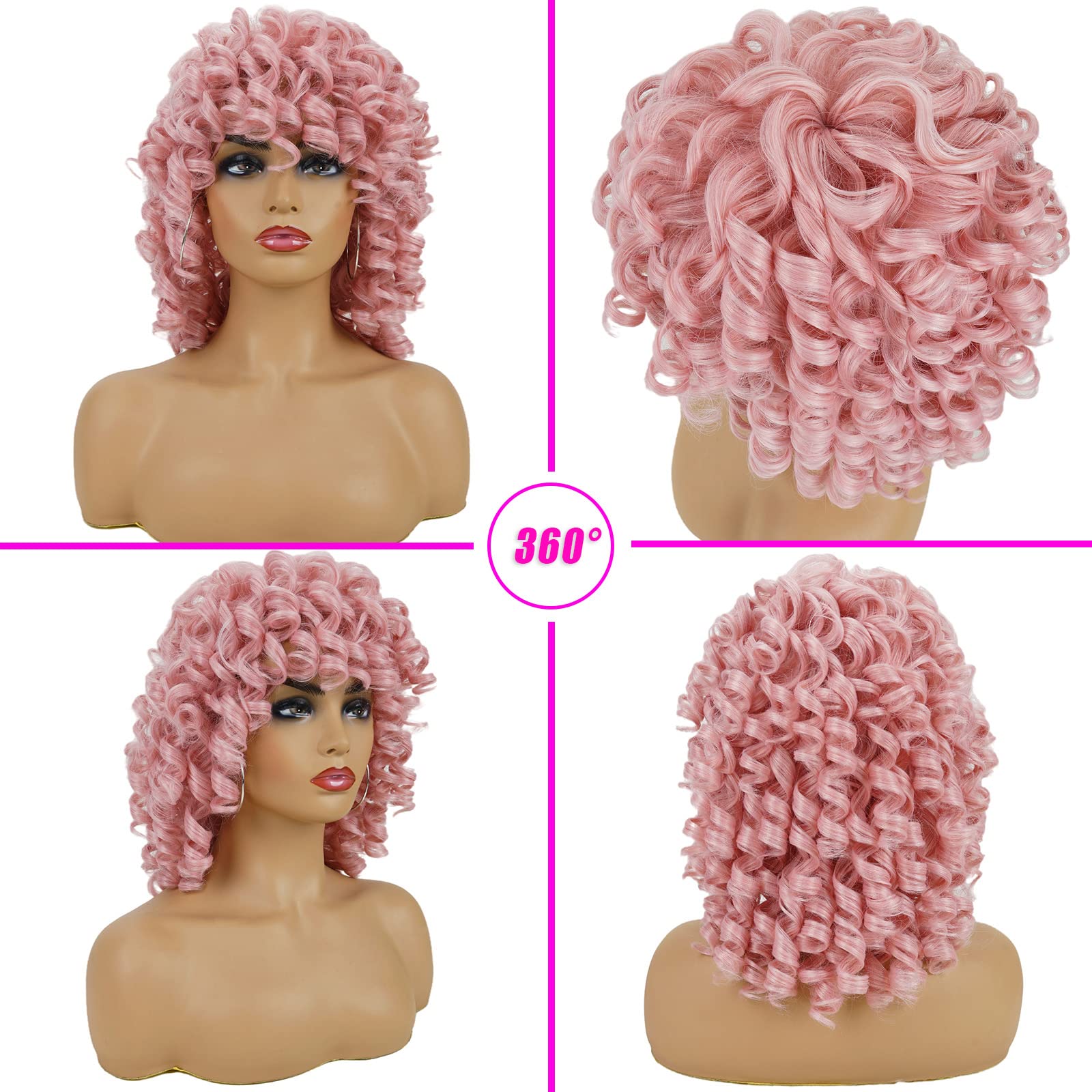 andromeda Pink Curly Wigs for Black Women Short Kinky Curly Wig with Bangs Loose Curly Heat Resistant Fiber Hair Wig for Women Halloween Cosplay Party Wigs (Pink)
