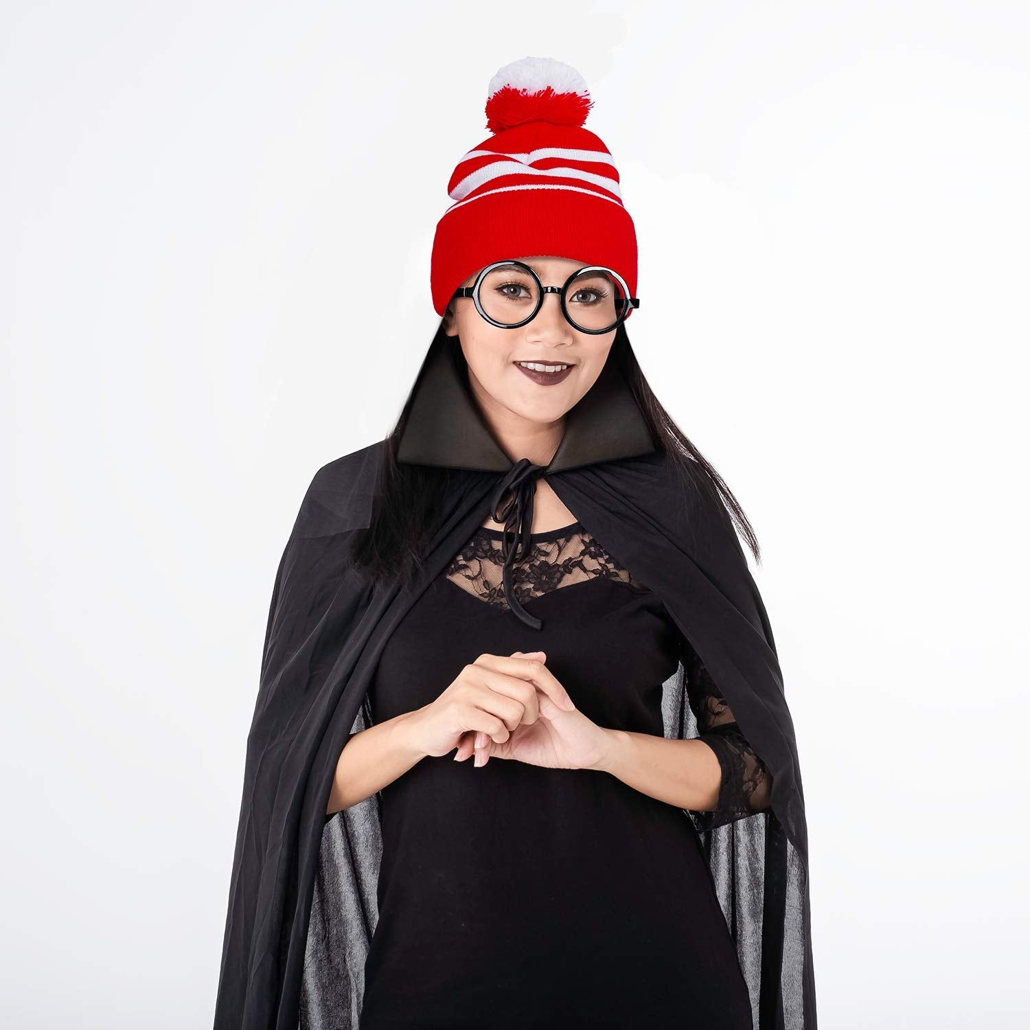 Aneco Halloween Red White Knit Beanie with Pompoms Nerd Costumes Glasses for Men and Women