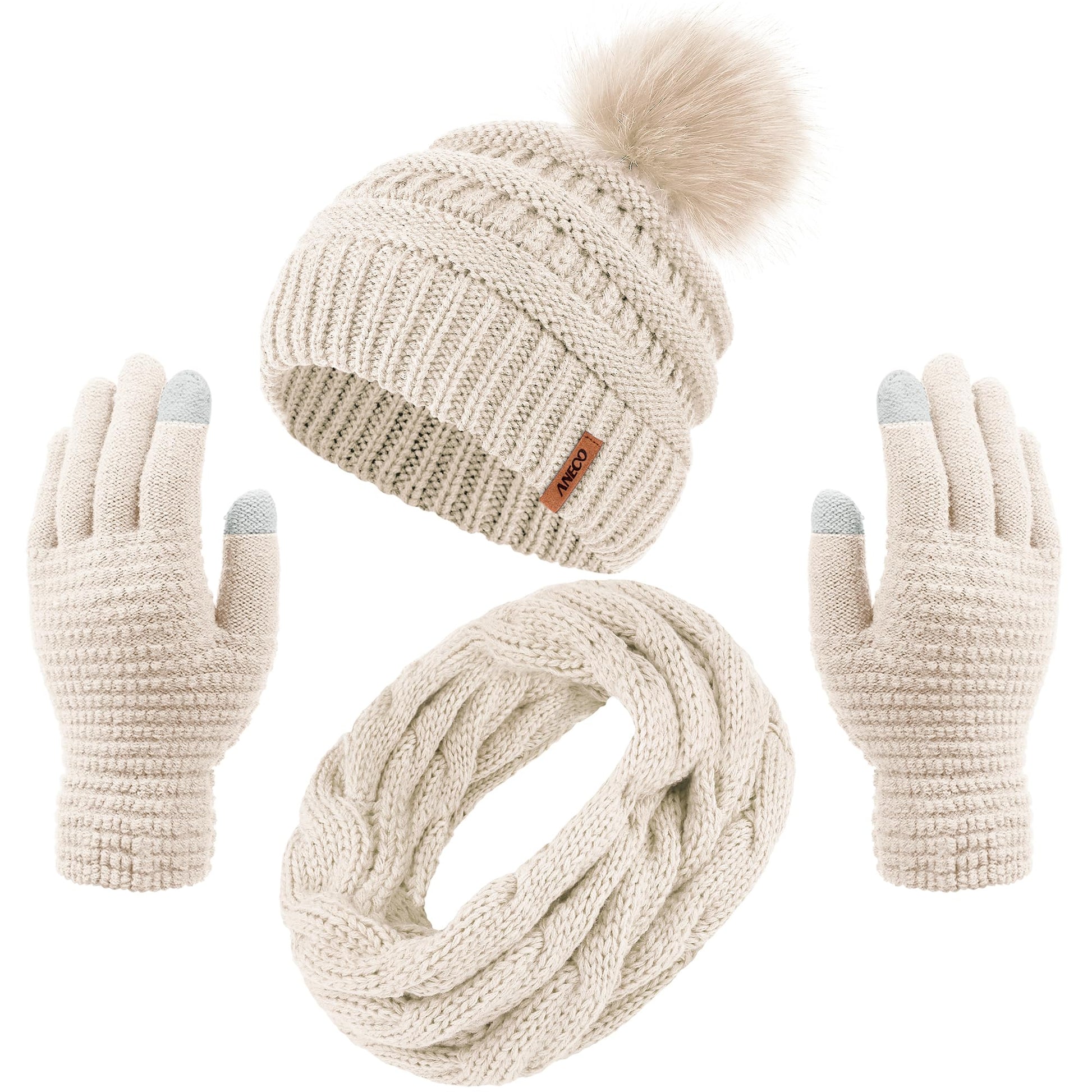 Aneco Womens Winter Warm Sets Knitted Fur Pompoms Beanie Hat Circle Loop Scarf Touch Screen Gloves Winter Favor Accessories