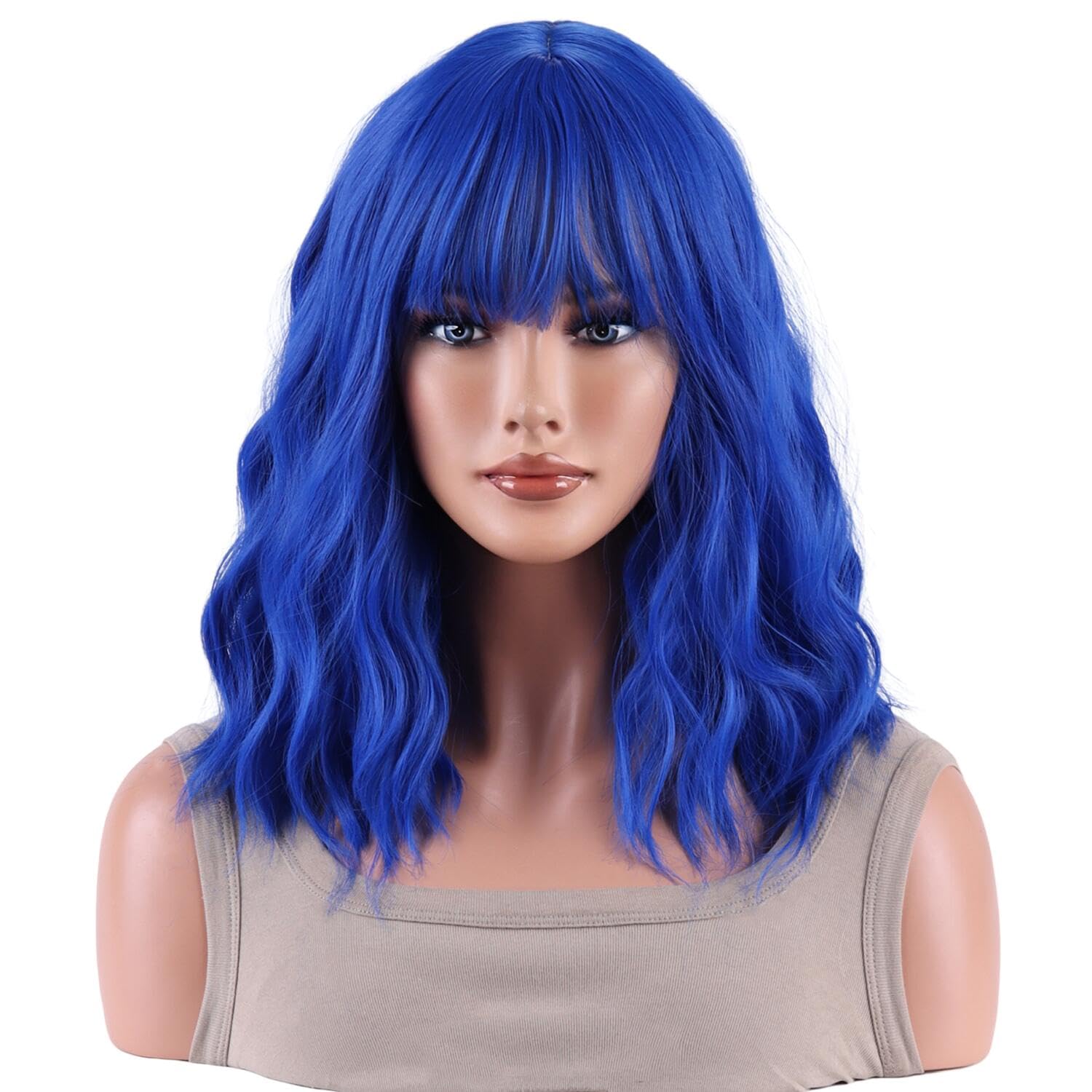 AneShe Dark Blue Wig Short Colored Wavy Bob Wigs with Bangs Curly Synthetic Colorful Wigs Blue Costume Wigs for Party Cosplay (14" Dark Blue)