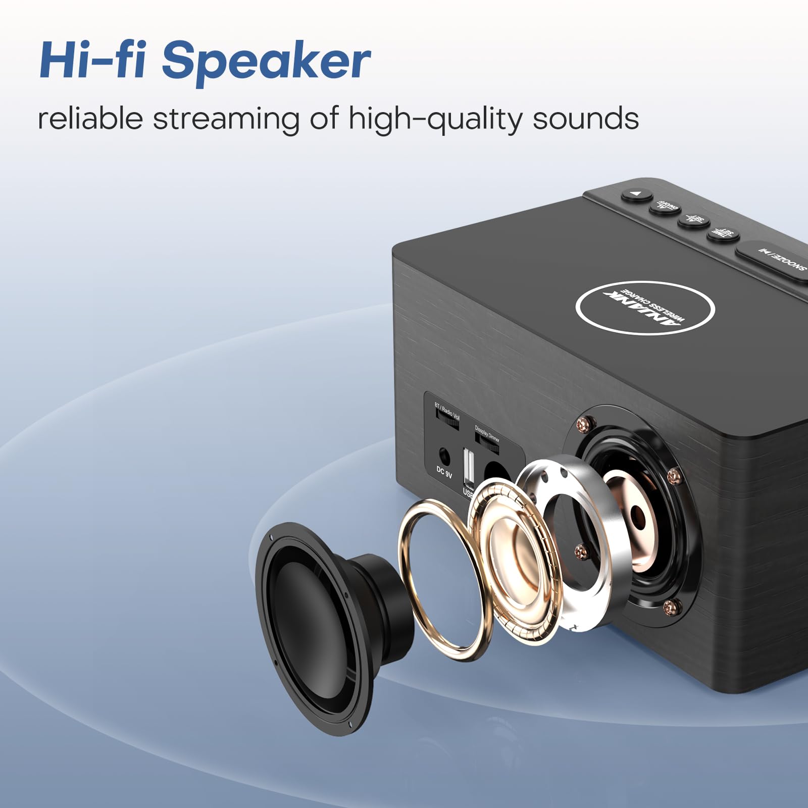 ANJANK Wooden Bluetooth Speaker, Alarm Clock with FM Radio, Qi Certified Fast Wireless Charging Station for iPhone/Samsung, USB Charger Port, Dimmable Display, Digital Wood Clock for Bedroom, Bedside