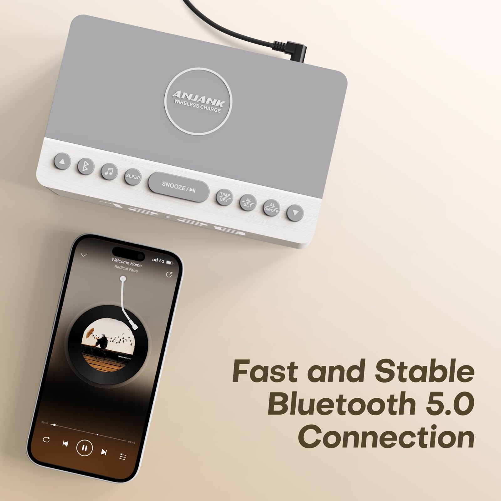 ANJANK Wooden Sound Machine Alarm Clock for Bedroom, Bluetooth Speaker, 20 Soothing Sounds, 0-100% Dimmer, Wireless Charging Station for iPhone/Samsung, Sleep Timer, White Noise Machine for Sleeping