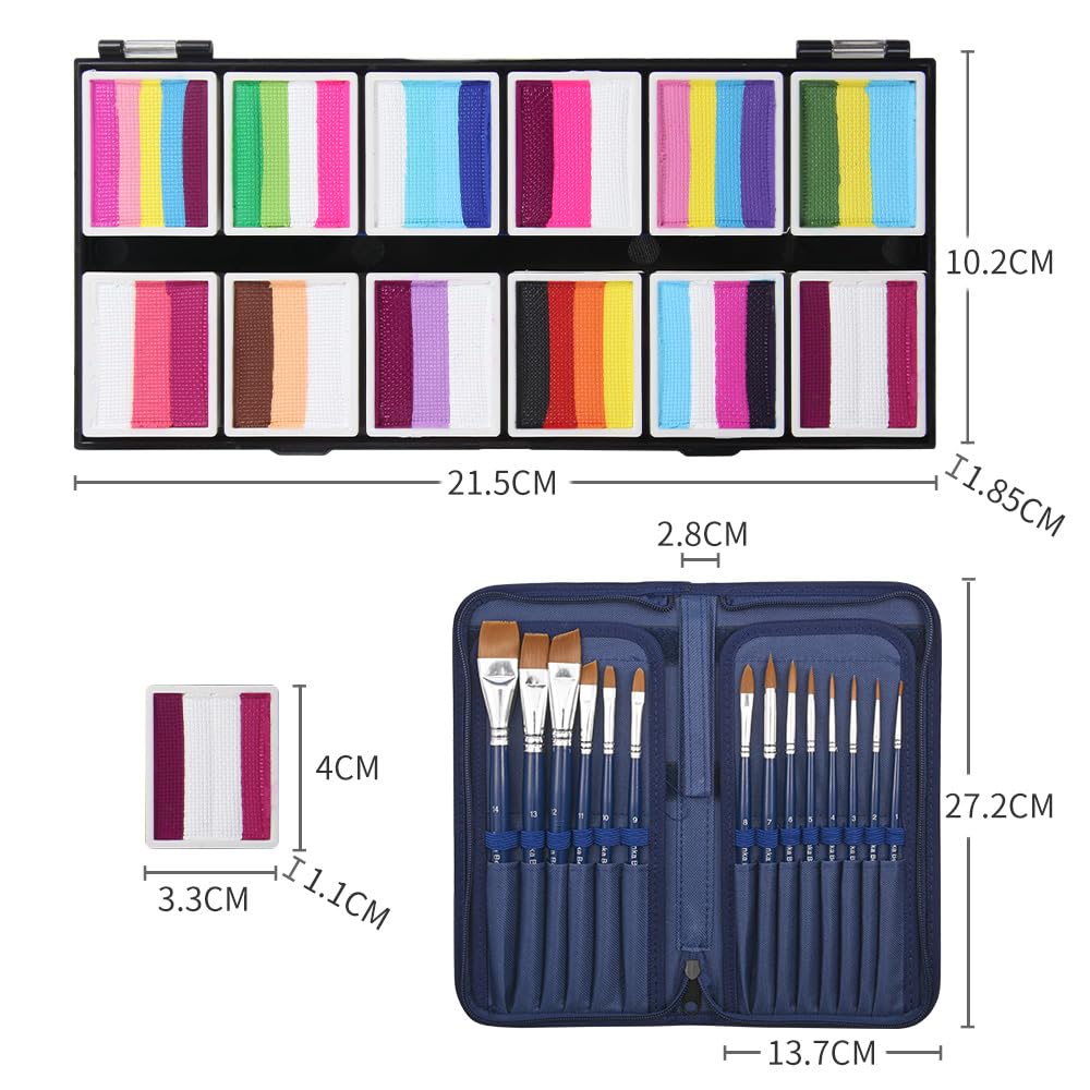 - Professional and comprehensive face paint kit: This set includes a 12x10gm face paint palette, 14 types of professional face painting brushes with a matching brush bag, and 9 pattern templates that can be used to create beautiful designs