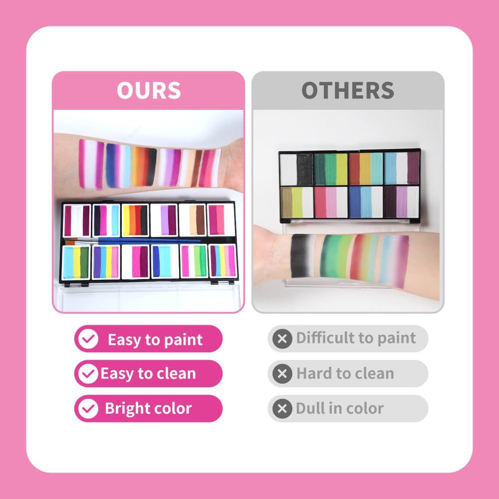 - High-quality painting experience: The pigments are bright, and long-lasting, ensuring your makeup stays perfect. They are made with safe, non-toxic formulas that are easy to remove with warm water and gentle soap, so you can enjoy beautiful makeup without worrying about skin damage