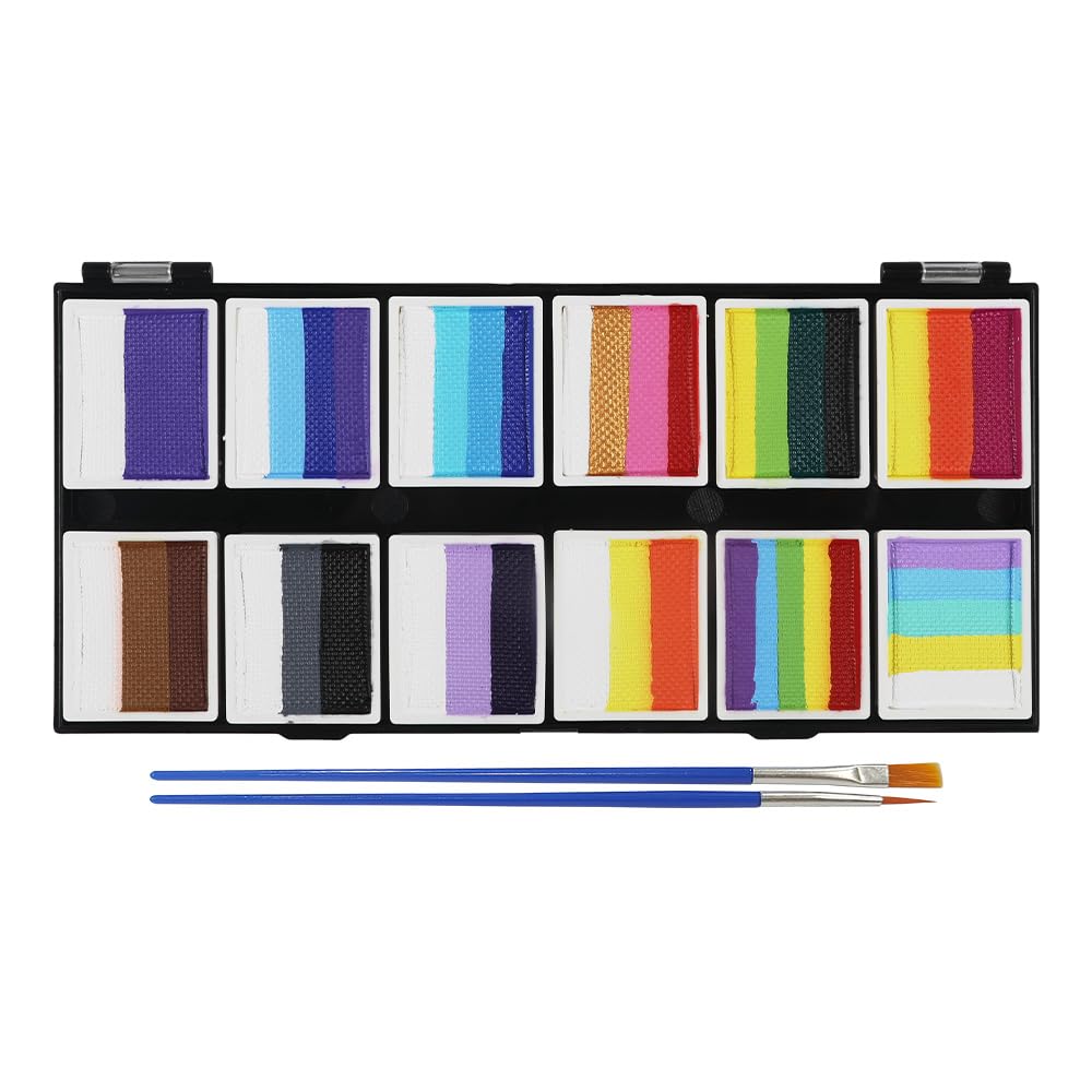 - 🌸【12 Color Rainbow Cake Paint Palette】 This is 12 x 10gram professional split cake, each lattice can be taken out separately to be more convenient to use, the pigment has high coverage, will not fall off and crack after painting on the skin. The water based face painting kit is easy to set up at an event, easy for beginner or professional painter to create variety patterns, perfect for bringing fun and color to any party.