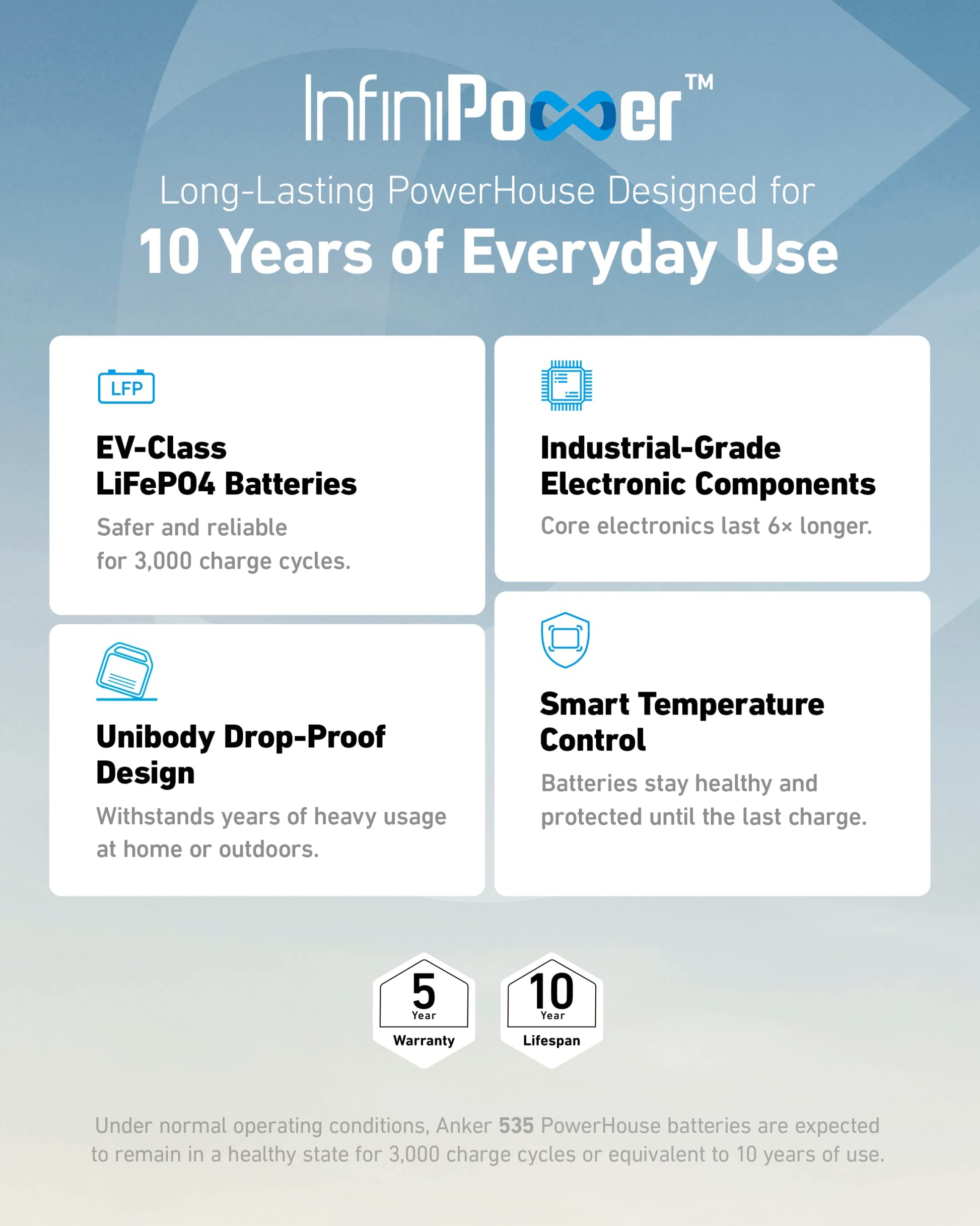 - Long-Lasting Portable Power Station With a 10-Year Lifespan: With our proprietary long-lasting technology InfiniPower, combined with LiFePO4 batteries, ultra-durable electronic components, a smart temperature control system that monitors temperature up to 100 times per second, and impact-resistant structural design, Anker 535 PowerHouse is built to last over a decade, even with everyday use.