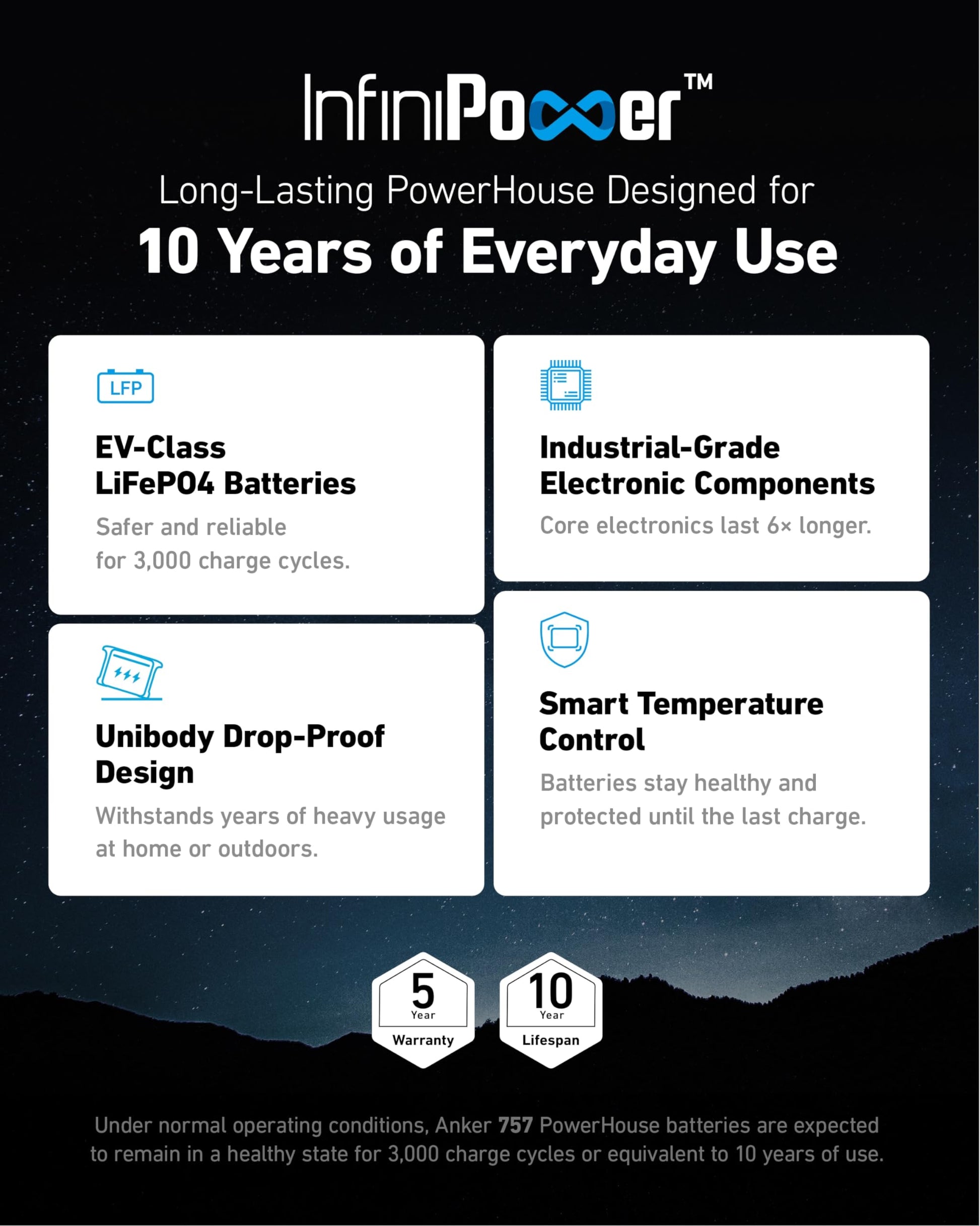 - Long-Lasting Portable Power Station With a 10-Year Lifespan: With our proprietary long-lasting technology InfiniPower, combined with LiFePO4 batteries, ultra-durable electronic components, a smart temperature control system that monitors temperature up to 100 times per second, and impact-resistant structural design, Anker 757 PowerHouse is built to last over a decade, even with everyday use.