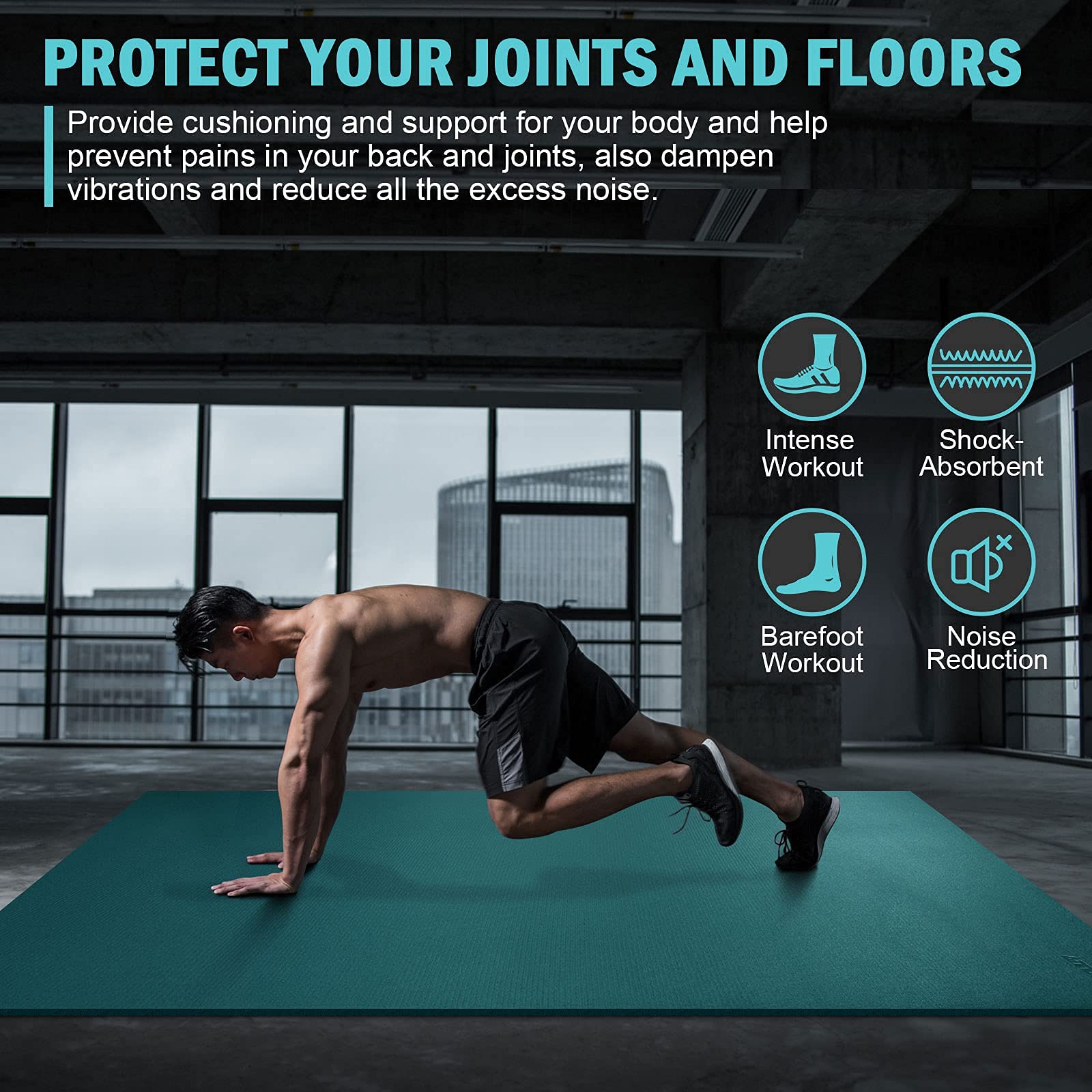 - ✅EXTRA-LARGE HOME GYM MAT COVERS 40 SQUARE FEET: The 8’x5’x7mm large fitness mat instantly transforms any space into a professional gym, giving you and your partners more than enough room to workout on without feeling cramped, and the floor mat is even shoe-friendly, whether you’re doing cardio, yoga, weightlift, dance workout including P90x, MMA, TAM, insanity, T25, Zumba, TRX, kettlebell, jumping rope or need large mats to install underneath a treadmill or weight bench, try this exercise mat.