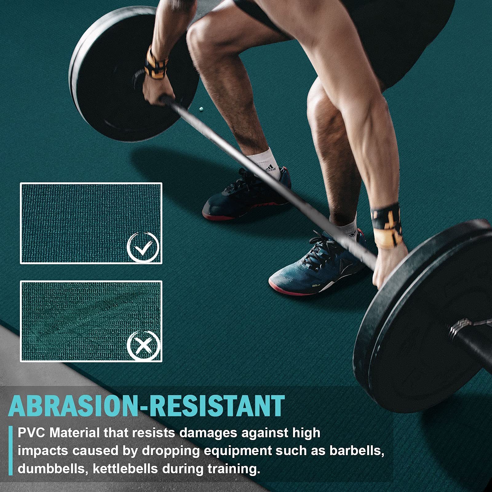- ✅ UPGRADED ABRASION-RESISTANT NO-SLIP PADDING: Workout mats' top utilizes a smart PVC material, that’s designed to prevent tear and scratch, resisting damages against high impacts caused by dropping equipment such as barbells, dumbbells during training, making exercise mats for home workout easier to wipe up after use. Bottom circle-pattern prevent gym floor mat from sliding around and secure traction, the sports mats create perfect combination of heavy-duty toughness, comfort and stability.