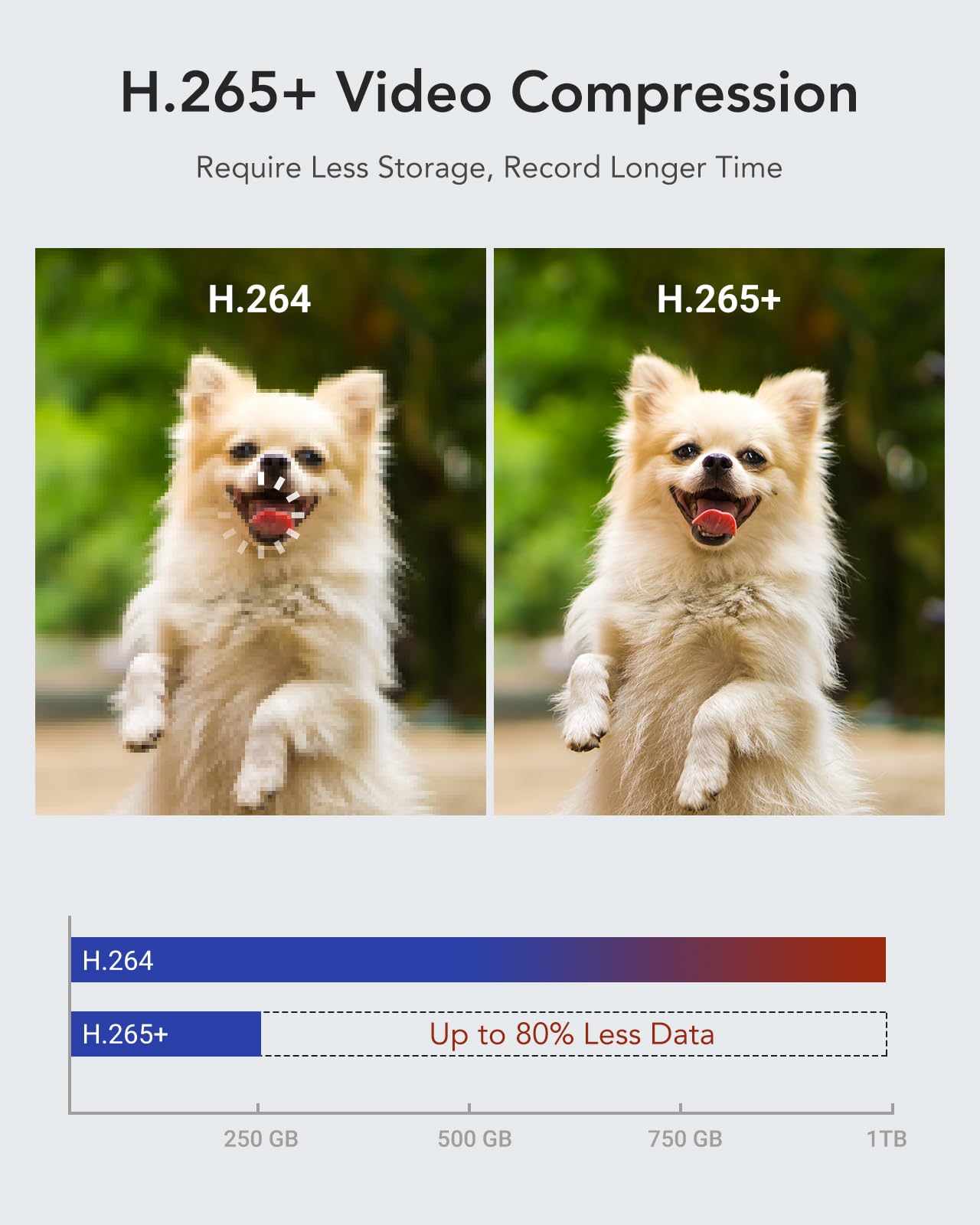 - 【Advanced H.265+ Video Format】H.265+ coding offers longer recording time before having to overwrite the older recordings, saving up to 50% of storage space than H.265 systems. You'll enjoy fast & smooth streaming without latency when accessing the DVR.