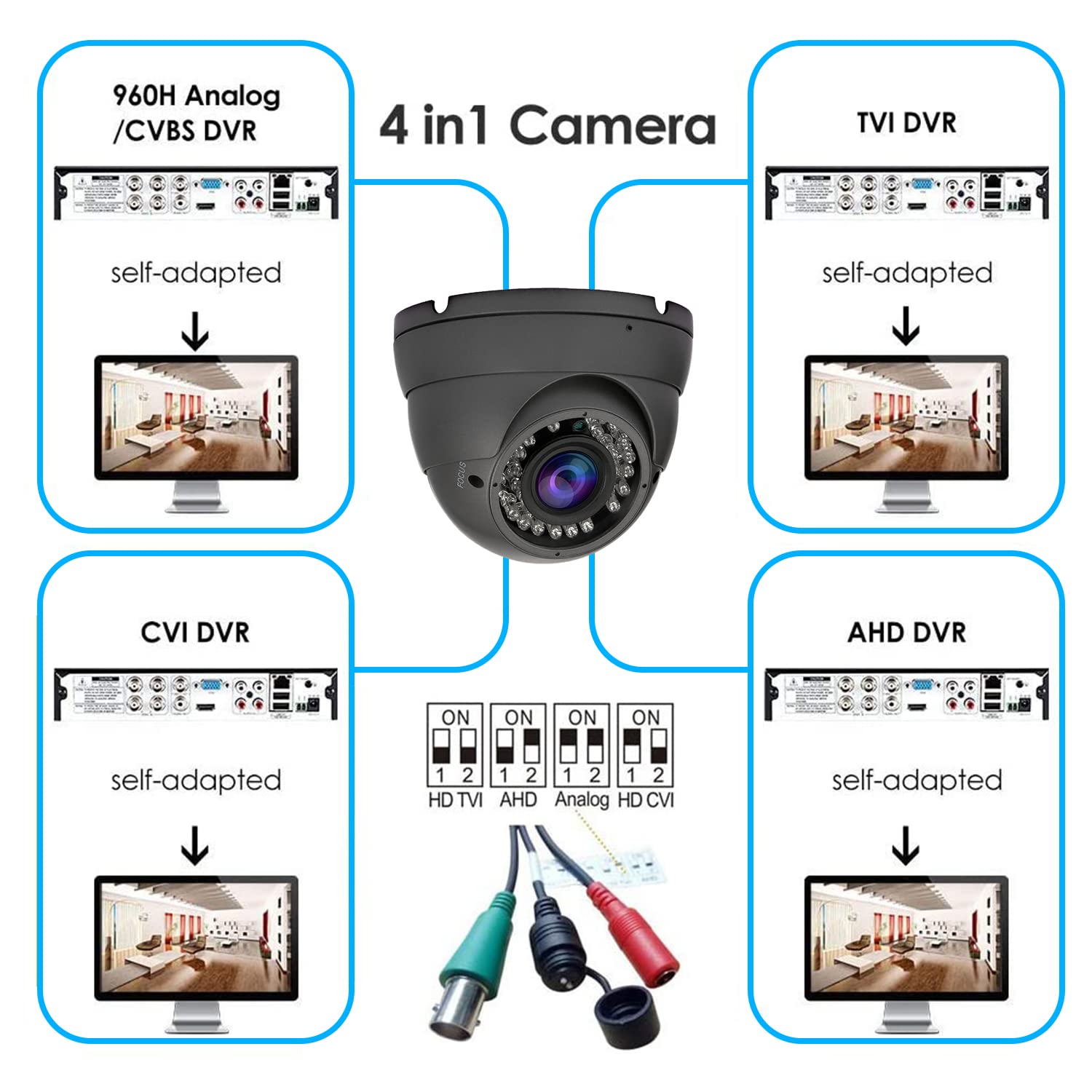 - 1080P HD TVI/CVI/AHD/ 960H CVBS 4 IN 1 Analog Dome Camera: This dome camera 1080P supports 4 different video output 1080P TVI, 1080P AHD, 1080P CVI and CVBS (960H). Required 1080P/1080Lite/1080N TVI/AHD/CVI DVR ( SDI DVR not compatible ) ( Some 720P DVR not compatible ) Required coaxiable BNC cable and power adapter but not included.