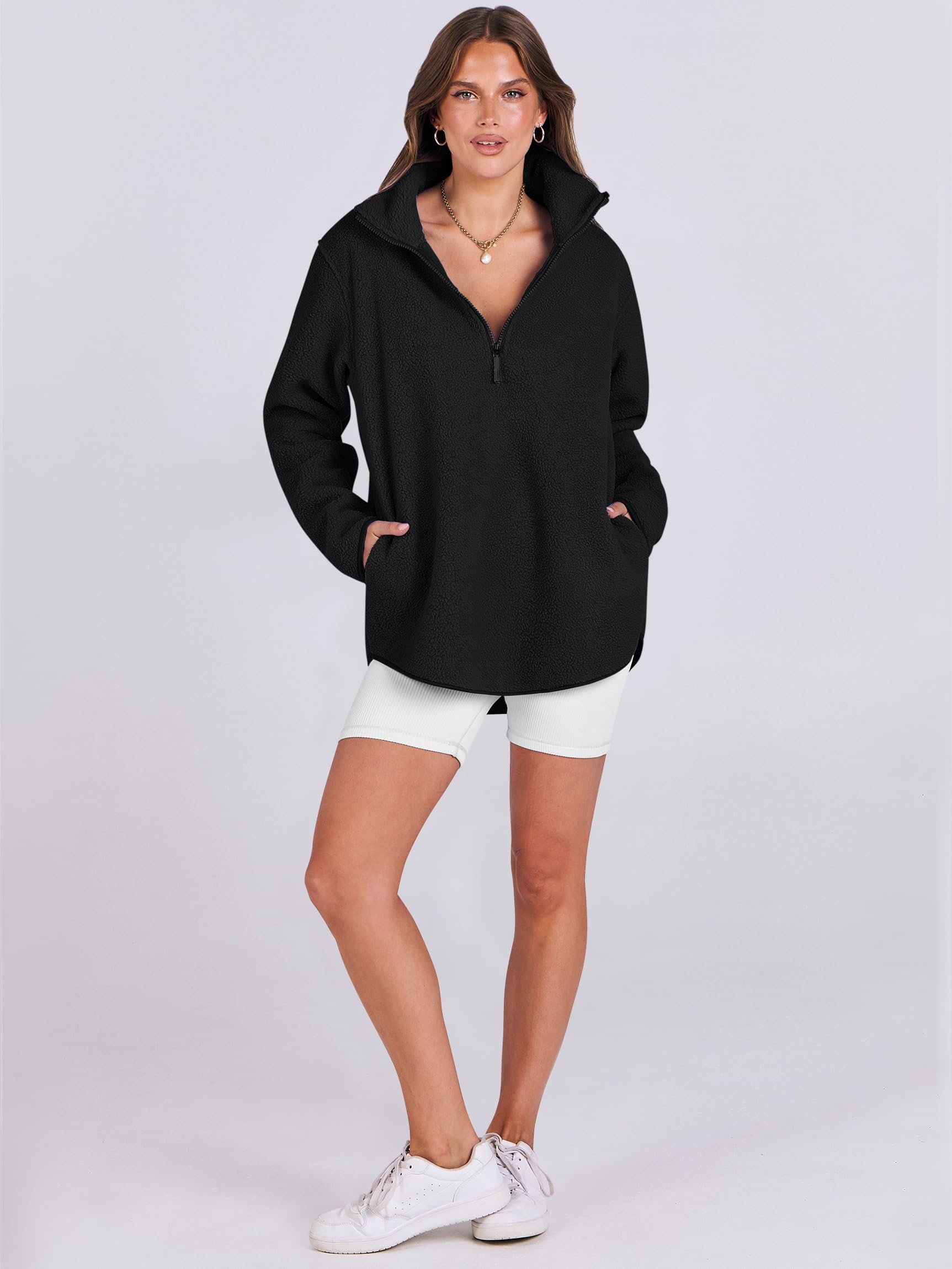 ANRABESS Women Oversized Sherpa Fleece Half Zipper Sweatshirts Fuzzy Collared Quarter Zip Pullover 2024 Fall Winter Clothes Black Small