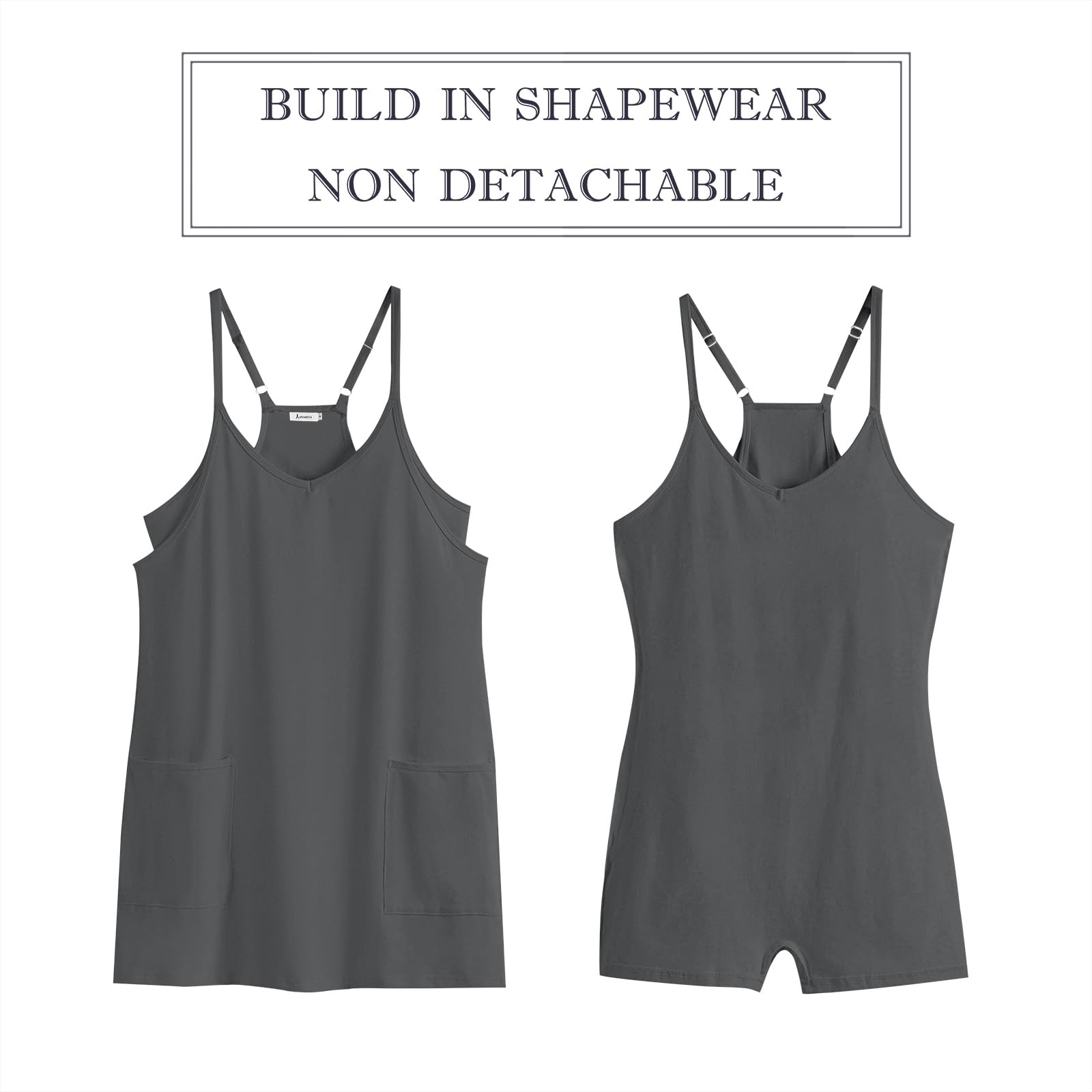 - Features - This workout mini dress build in shapewear featured spaghetti straps, V neck, patch pockets, solid color, making it perfect for staying cool and stylish during hot summer days.