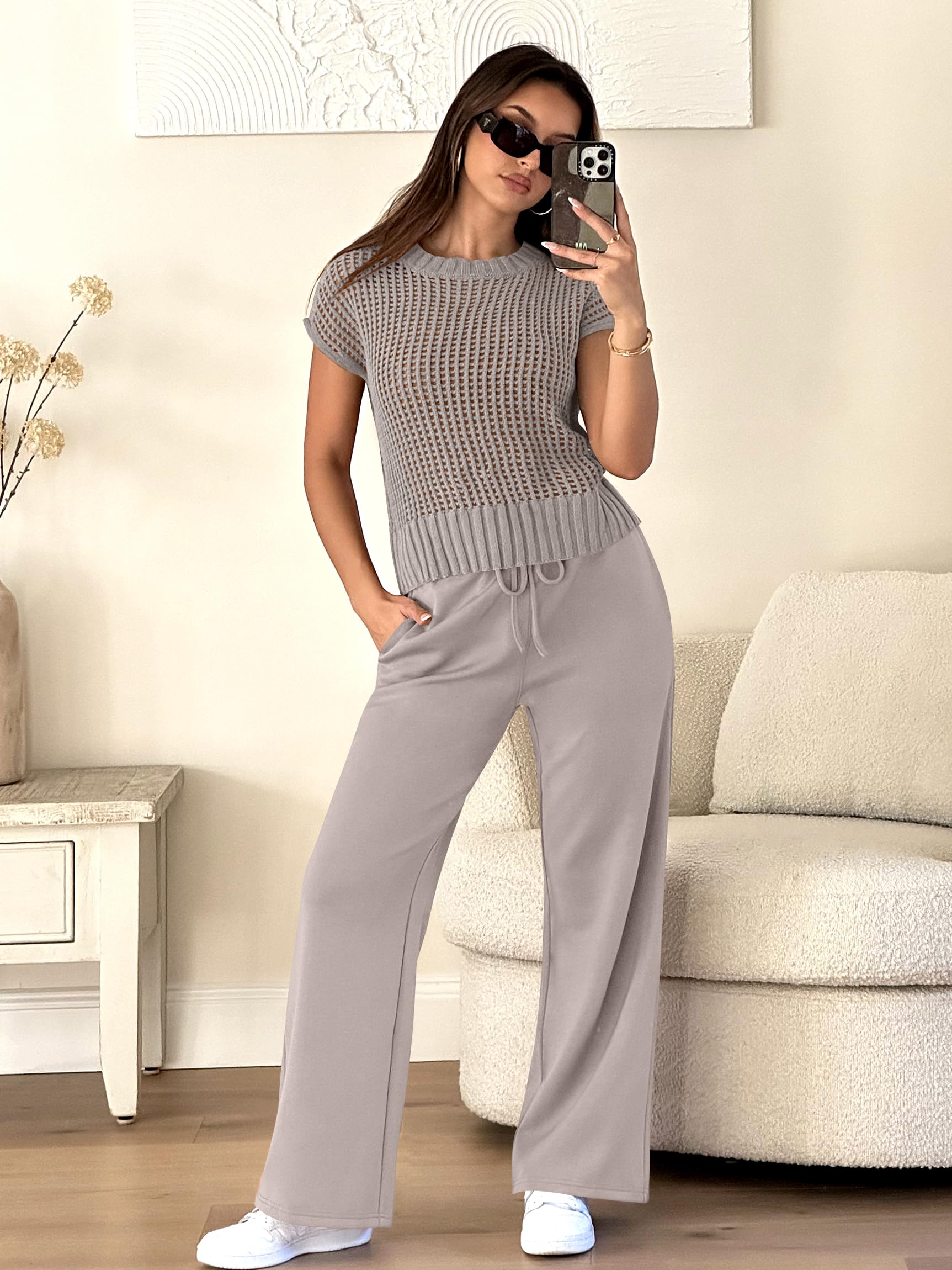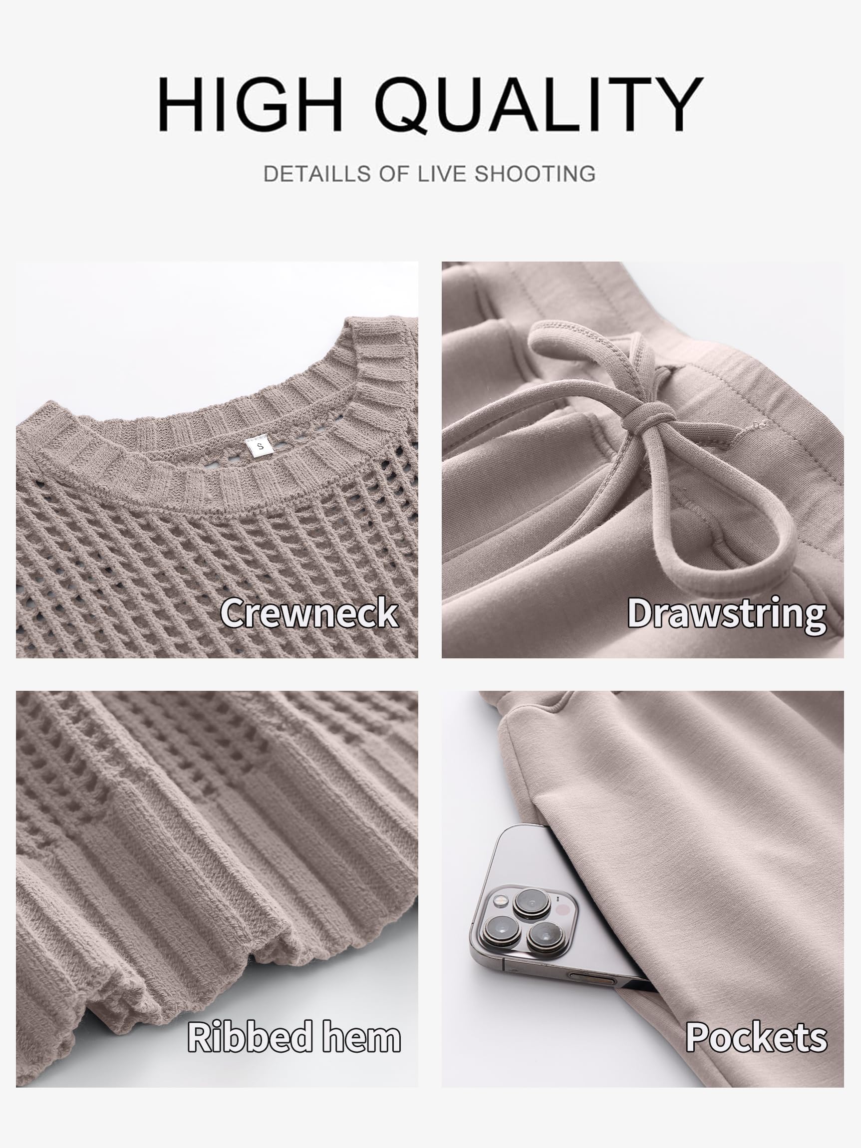 - Features - Women's Two Piece Outfits, hollow-carved design, crew neck, sheer pointelle stitch, short sleeve. This women's sweater set is perfect for daily wear, work, office, business, vacation.