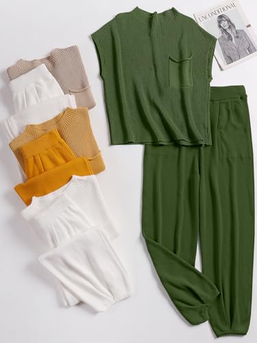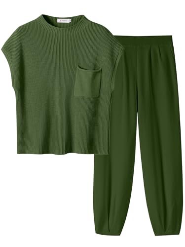 ANRABESS Women's Two Piece Outfits Knit Sweater Pullover Crop Top & Pants Lounge Matching Tracksuit Sweatsuit Sets 2024 Trendy Loungewear Clothes Amy Green X-Small
