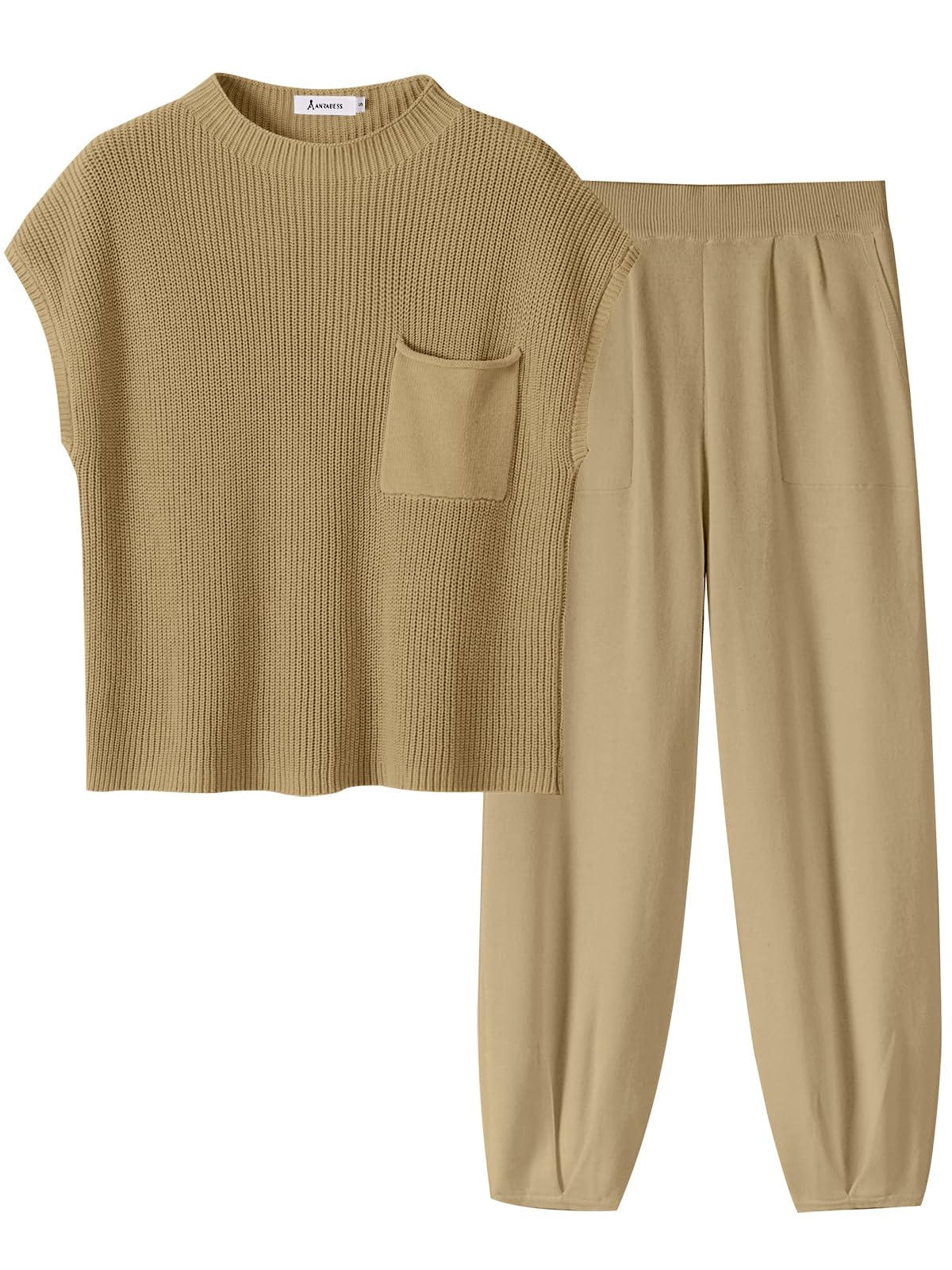 ANRABESS Women's Two Piece Outfits Knit Sweater Pullover Crop Top & Pants Lounge Matching Tracksuit Sweatsuit Sets 2024 Trendy Loungewear Clothes Brown Small