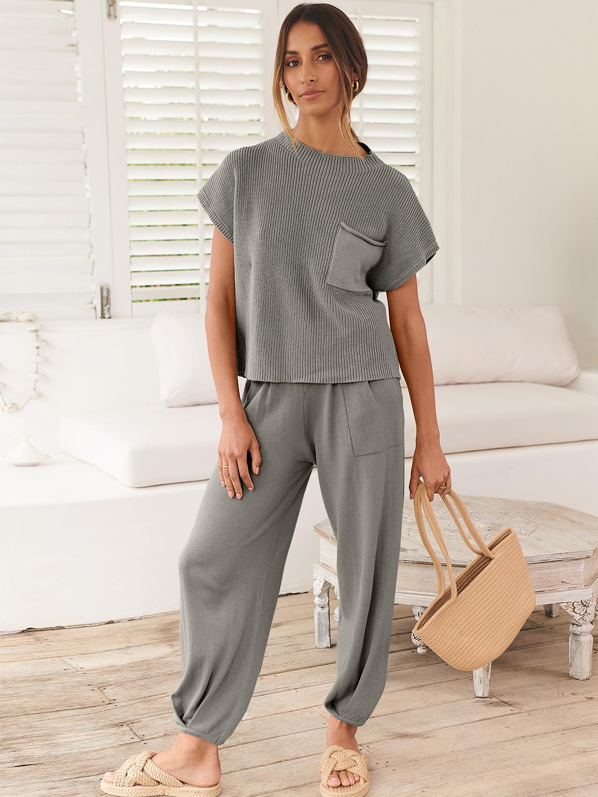 ANRABESS Women's Two Piece Outfits Knit Sweater Pullover Crop Top & Pants Lounge Matching Tracksuit Sweatsuit Sets 2024 Trendy Loungewear Clothes Grey X-Small