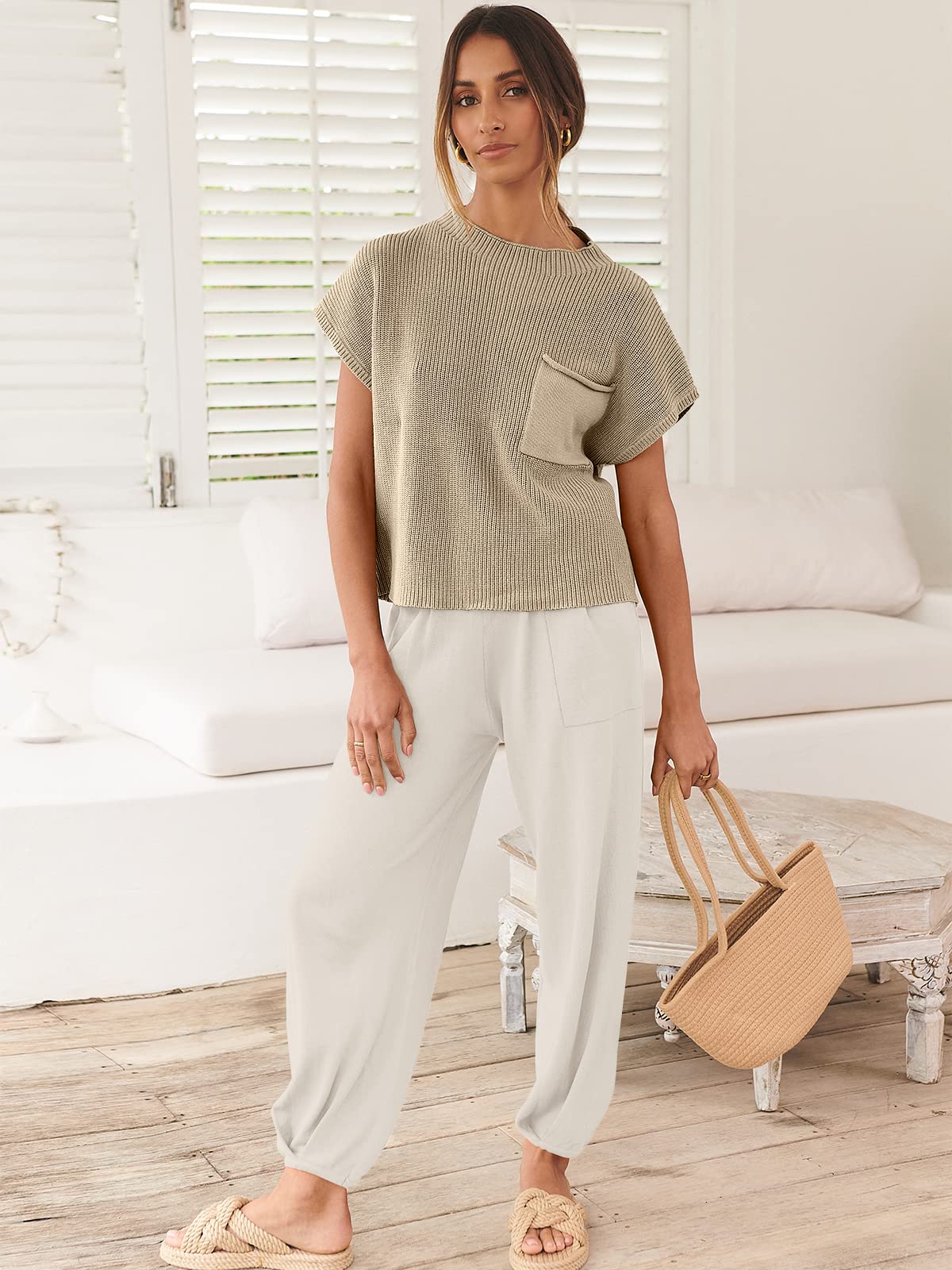 ANRABESS Women's Two Piece Outfits Knit Sweater Pullover Crop Top & Pants Lounge Matching Tracksuit Sweatsuit Sets 2024 Trendy Loungewear Clothes Khaki White X-Small