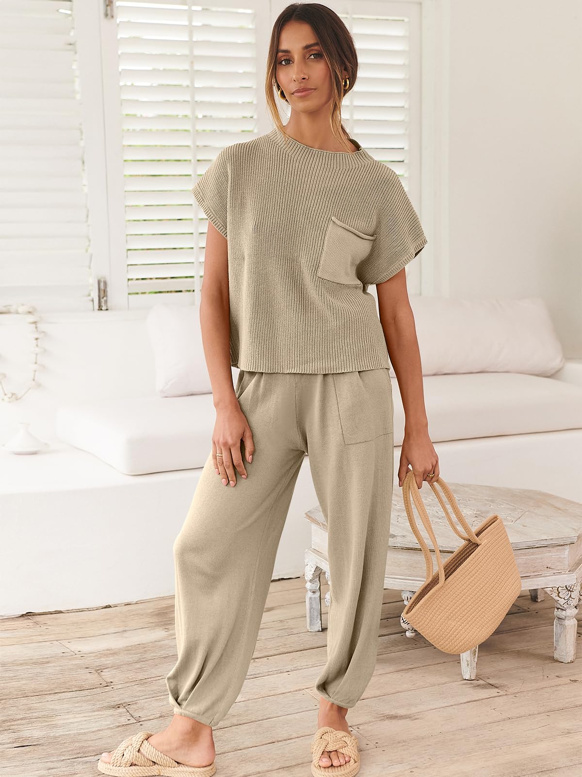 ANRABESS Women's Two Piece Outfits Knit Sweater Pullover Crop Top & Pants Lounge Matching Tracksuit Sweatsuit Sets 2024 Trendy Loungewear Clothes Khaki X-Small