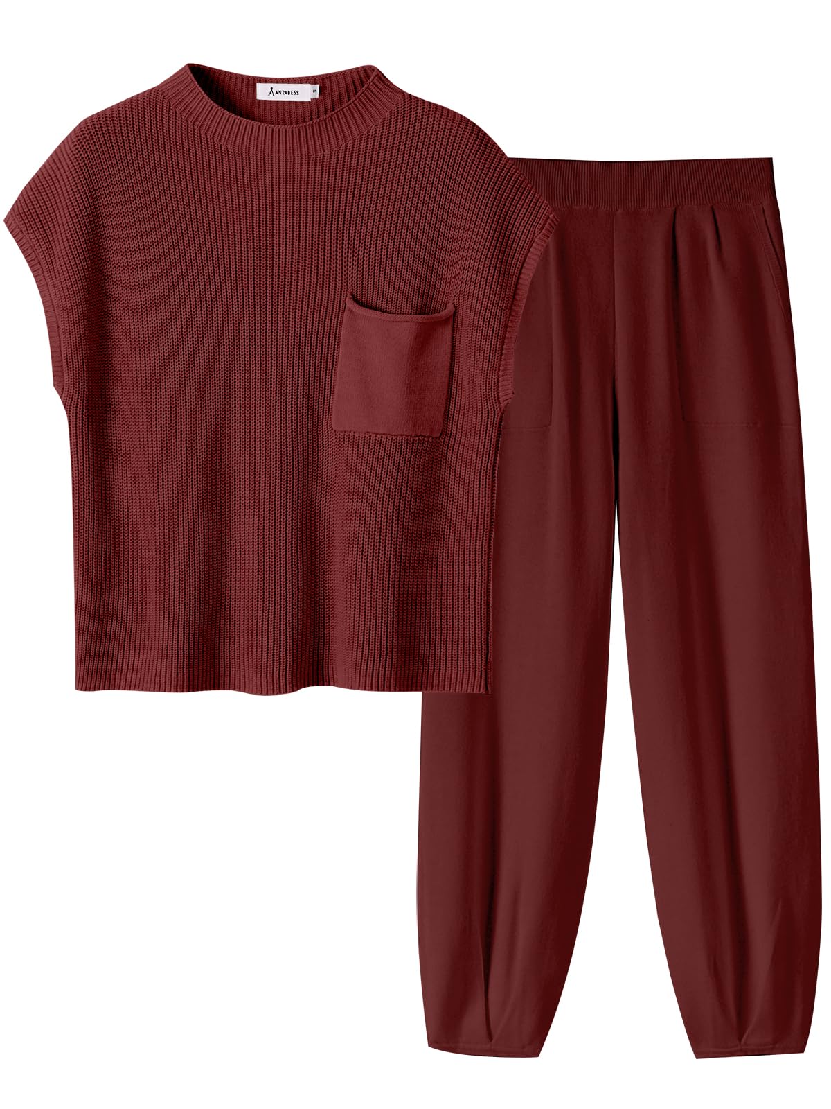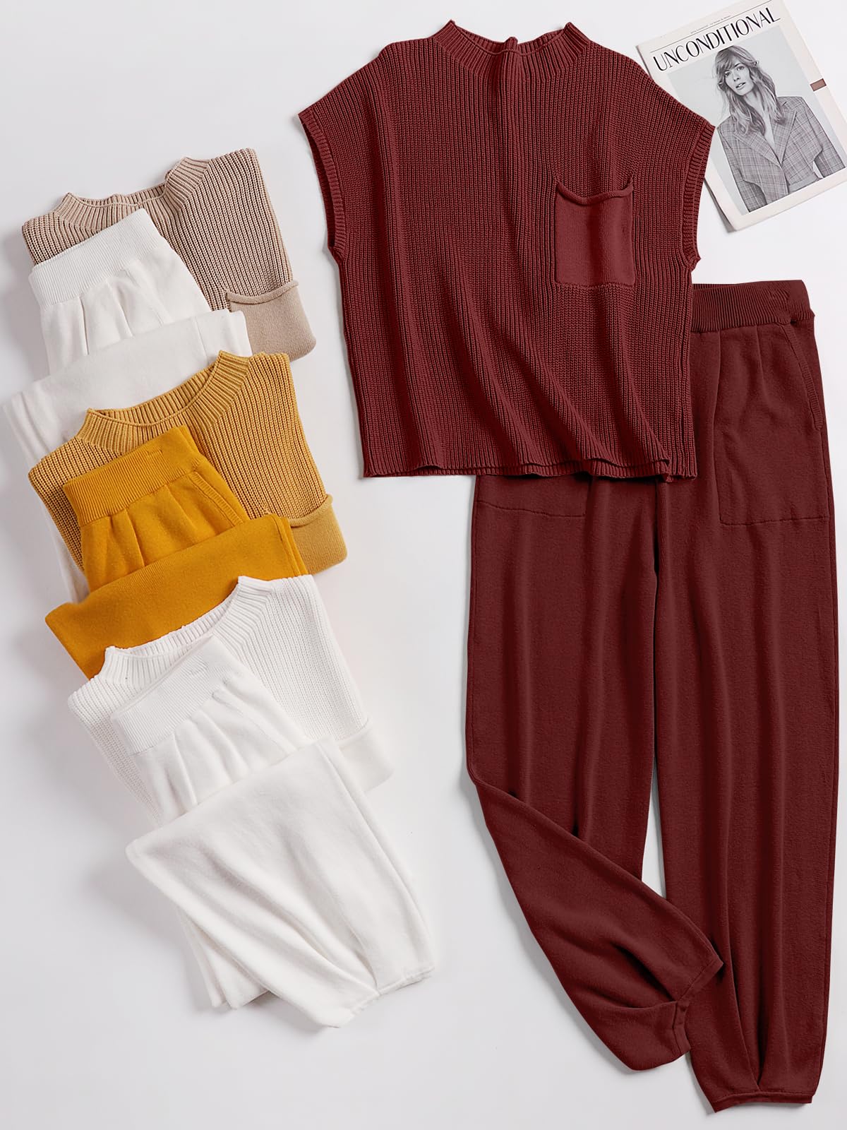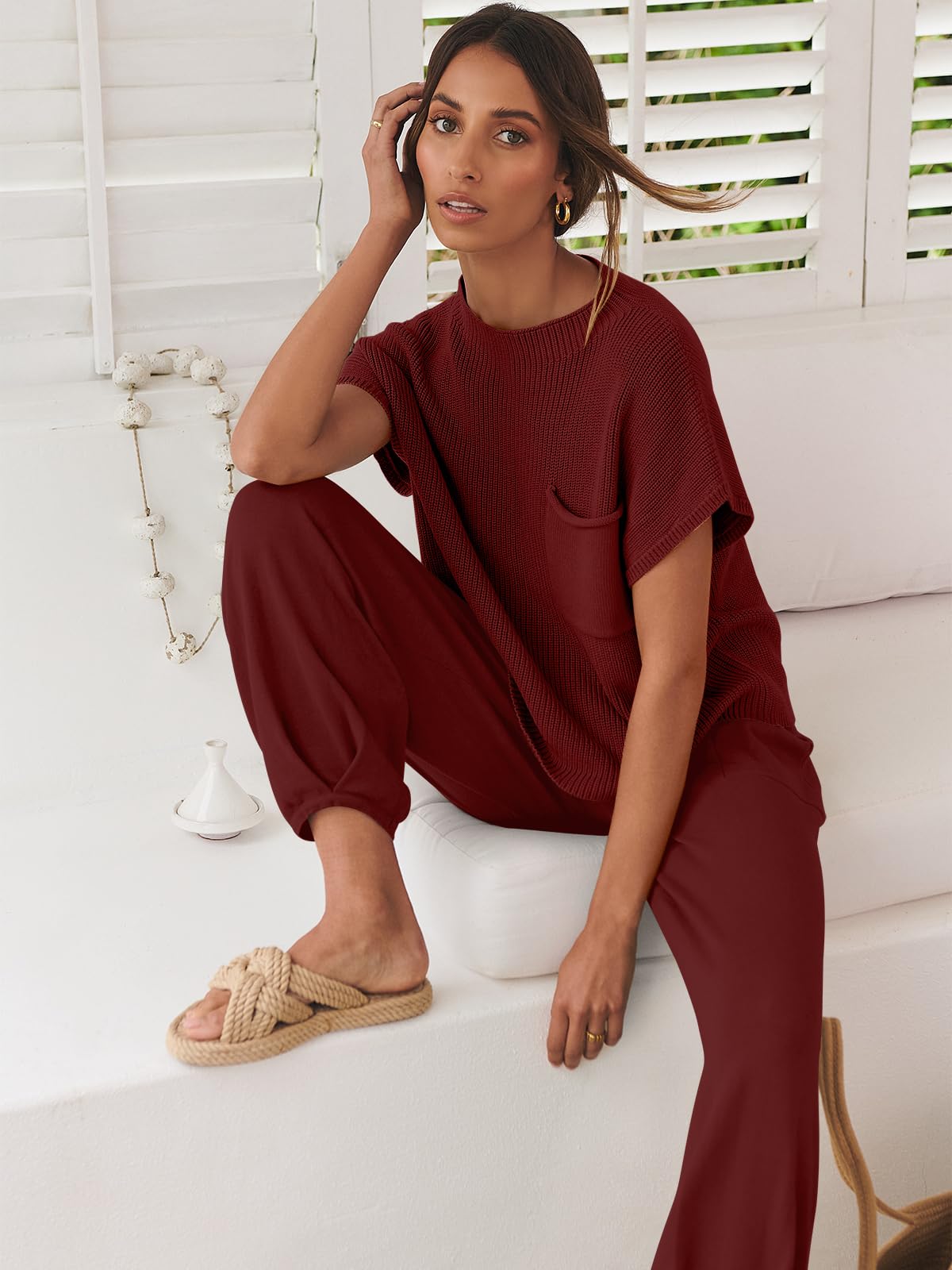 ANRABESS Women's Two Piece Outfits Knit Sweater Pullover Crop Top & Pants Lounge Matching Tracksuit Sweatsuit Sets 2024 Trendy Loungewear Clothes Red X-Small