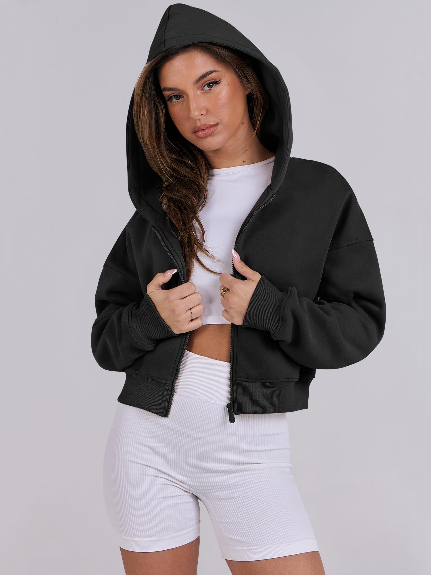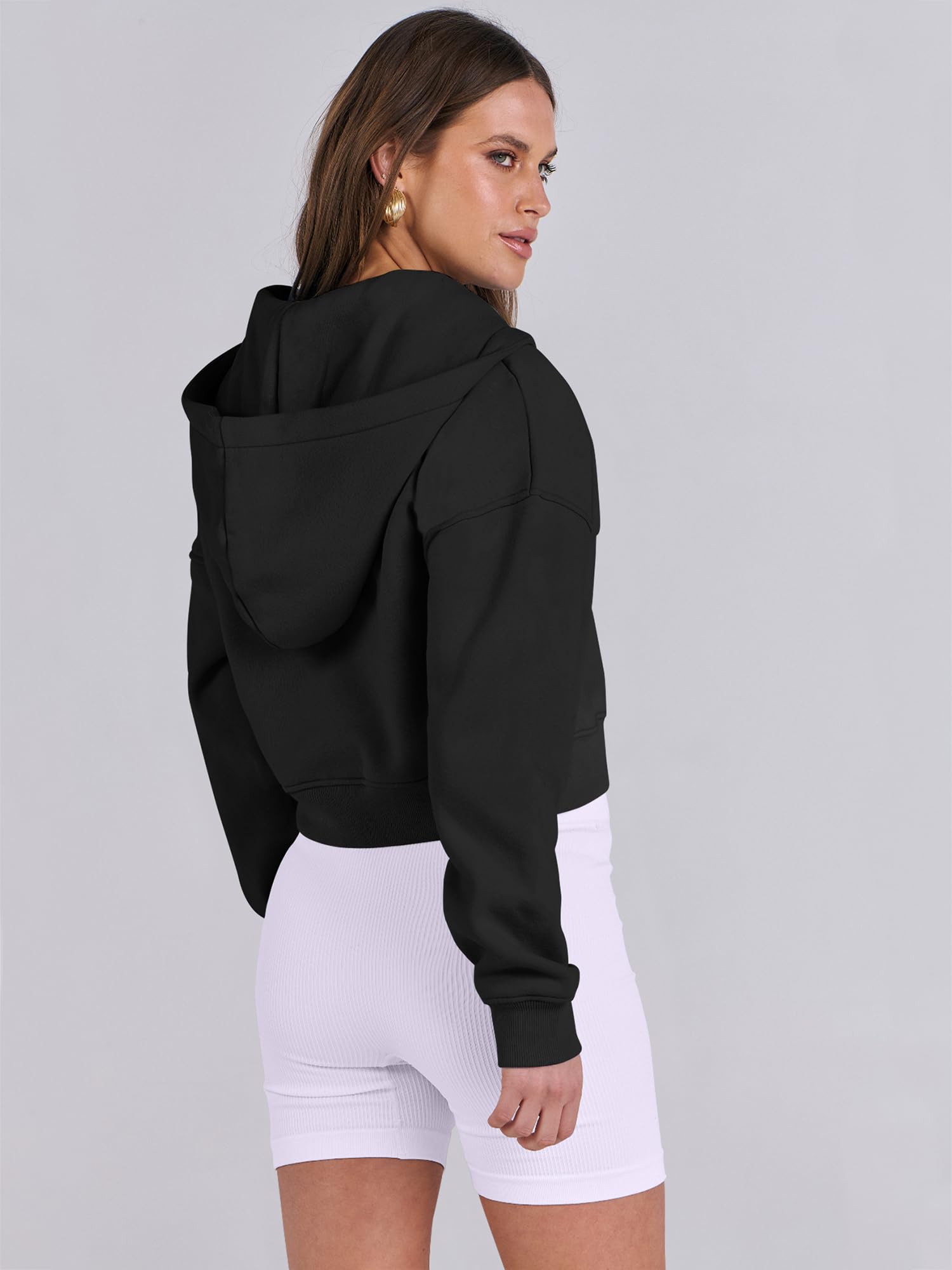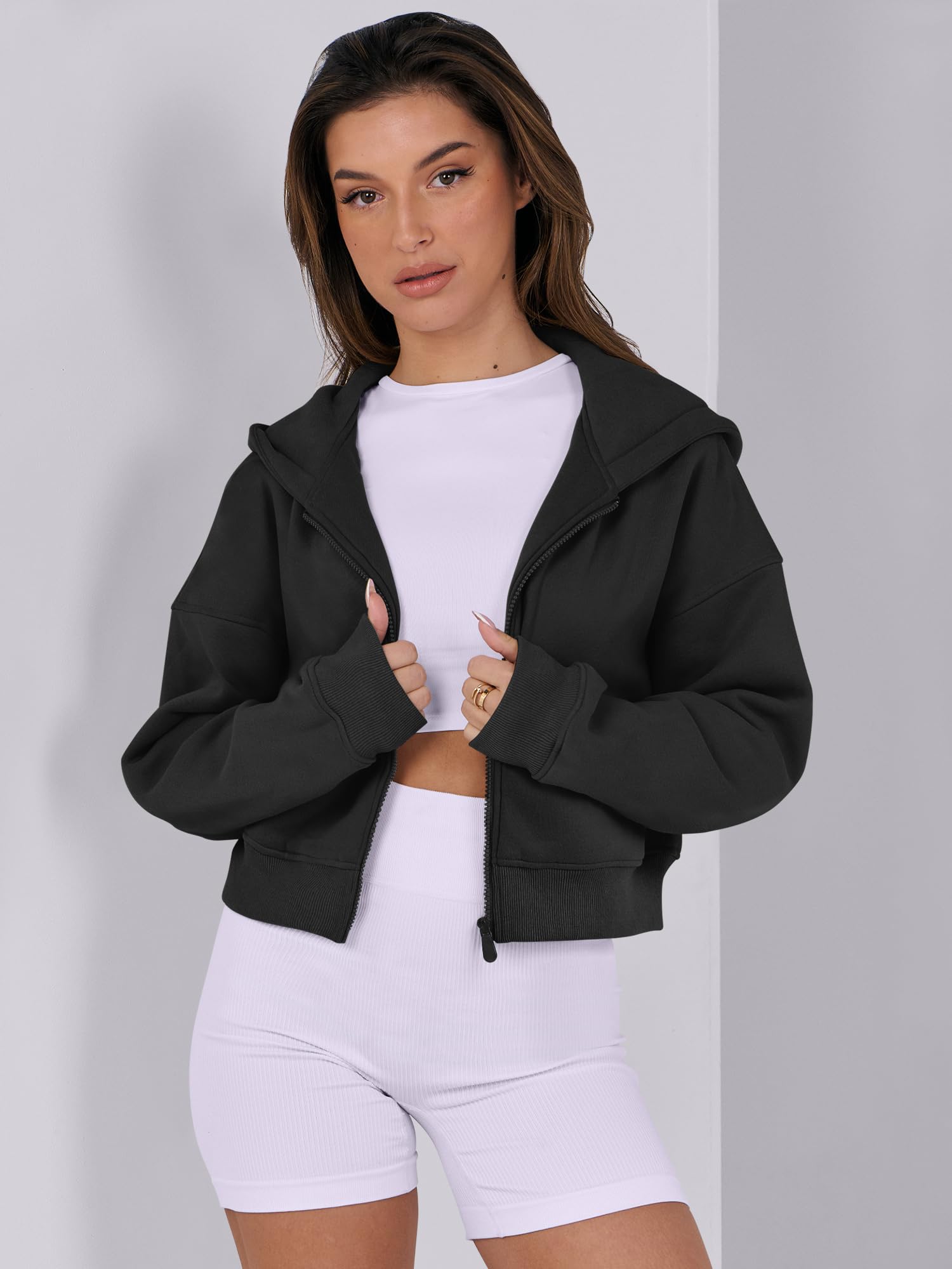 ANRABESS Womens Zip Up Crop Hoodie Sweatshirts 2024 Fall Trendy Long Sleeve Cropped Jacket Top Winter Teen Girls Clothes Black Medium