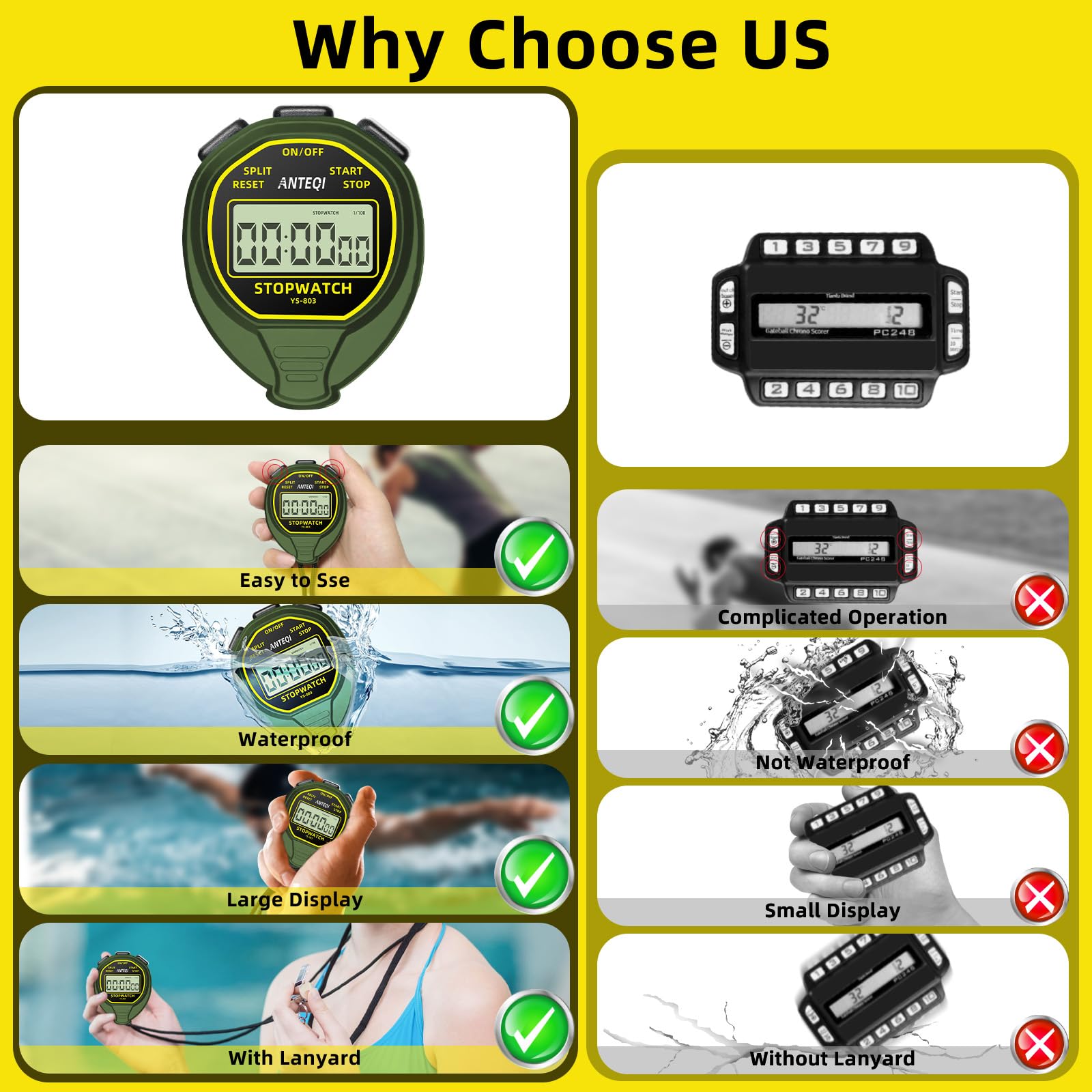 ANTEQI Waterproof Stopwatch, Large Display Simple Silent Stop Watch Timer with ON/Off Function No Clock No Calendar No Alarm Basic Operation for Sports Coaches Swimming Running Training, Green