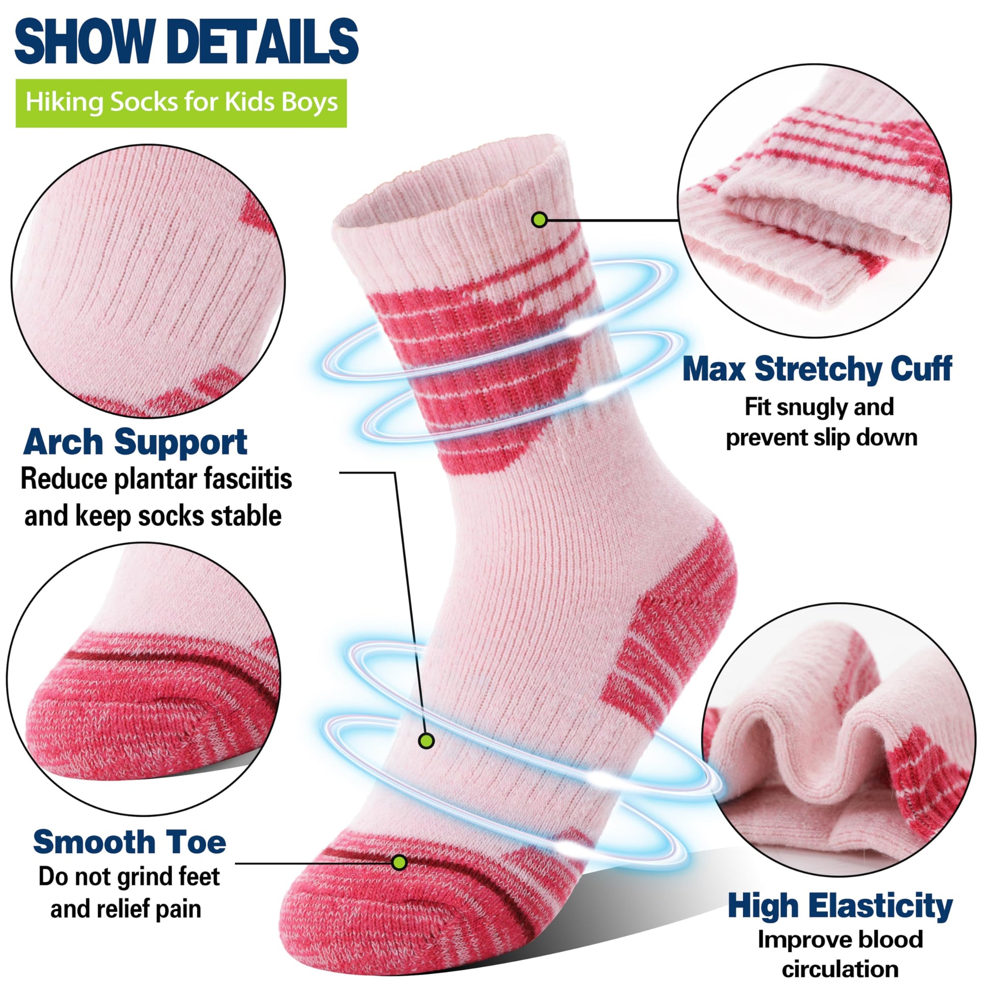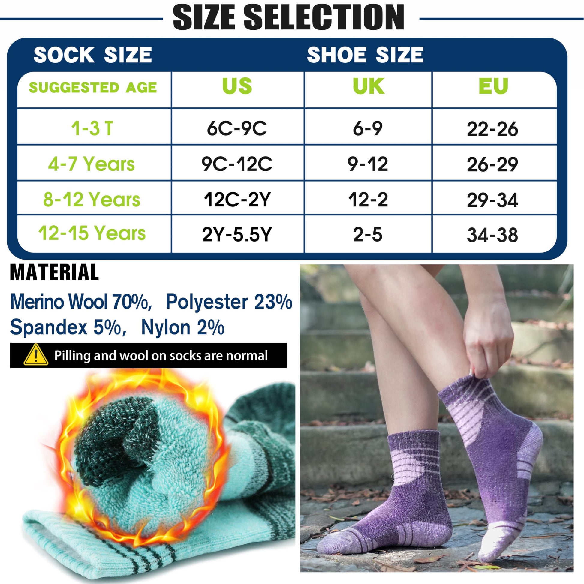- PACKAGE & SIZE: The package includes 6 pairs of merino wool hiking athletic socks for kids. We offer 4 size options: 1-3T, 4-7 Years, 8-12 Years, and 12-15 Years. (REMINDER: Pilling and wool on socks are normal.)