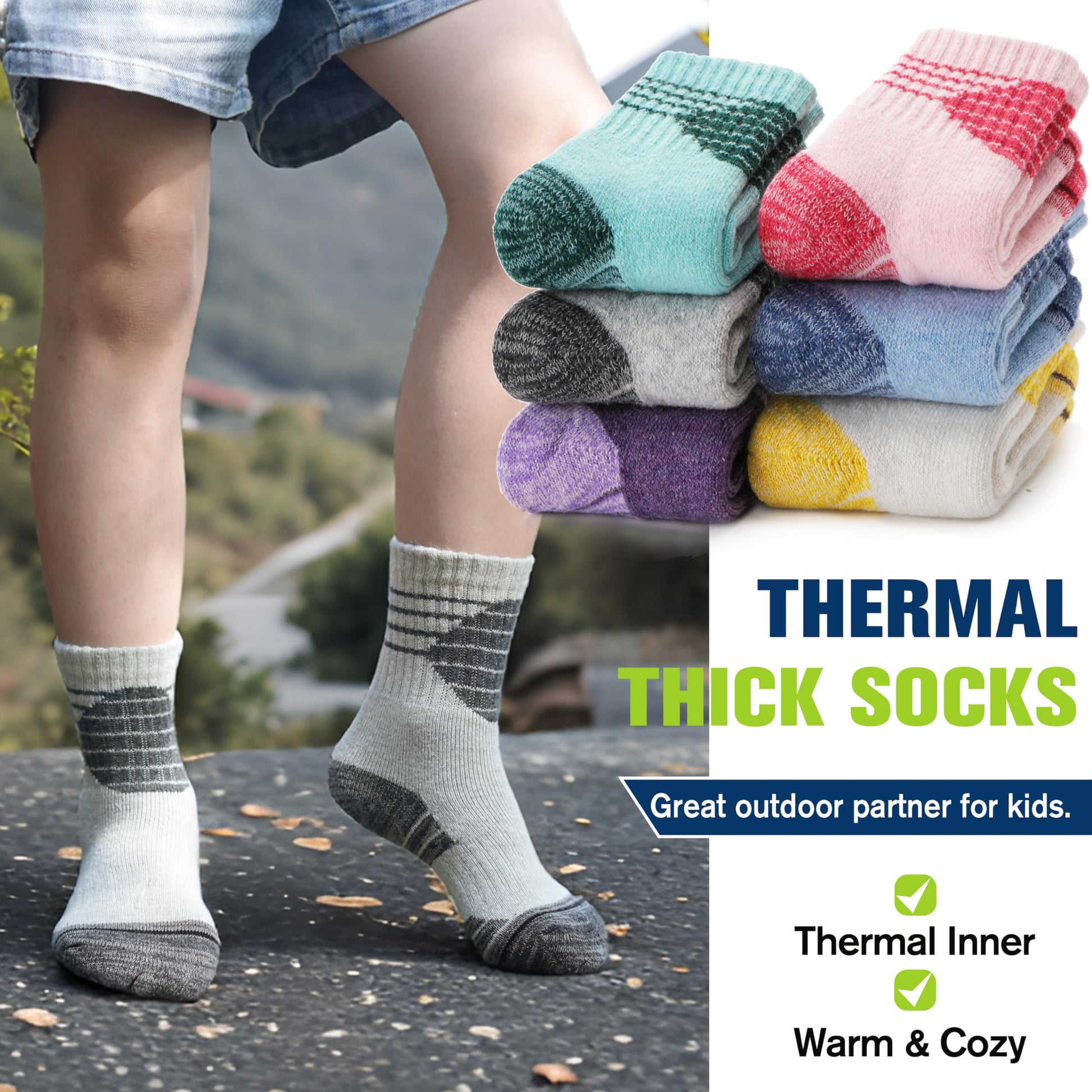 ANTSANG Kids Merino Wool Hiking Socks Boys Girls Toddlers Thermal Warm Winter Thick Cushion Snow Ski Crew Youth Socks 6 Pairs Gift Stocking Stuffers(Assorted,12-15 Years)