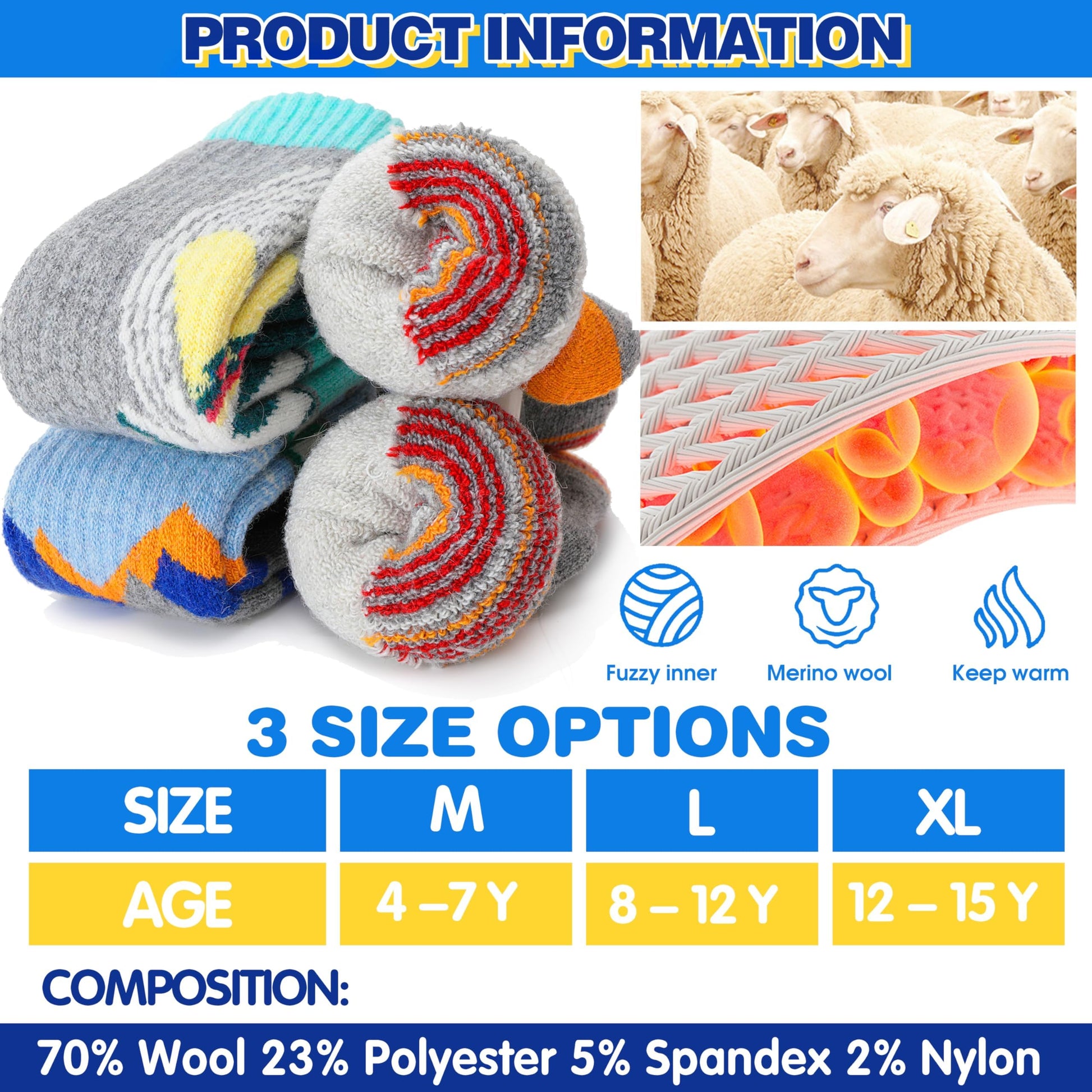 - MOISTURE CONTROL FABRIC: Made of 70% MERINO WOOL, 23% POLYESTER, 5% SPANDEX , 2% NYLON.The material of these wool ski socks are wear-resistant , durable , and temperature regulation.These thick socks for kids feature an excellent moisture control function, keeping kids feet dry and breathable at all times.