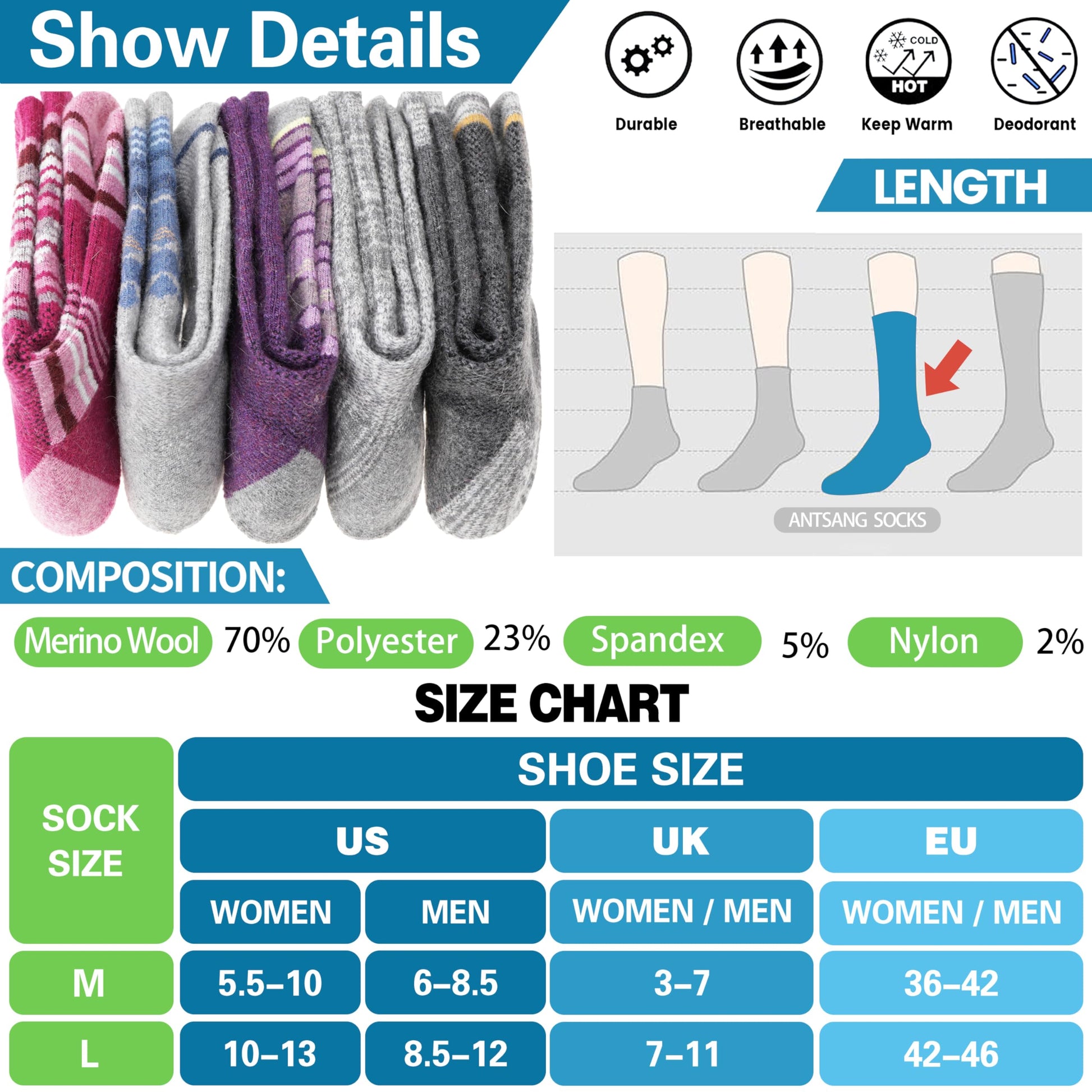 - š PACKAGE & SIZE : There are 5 pairs merino wool hiking socks for mens and womens. We offer 2 sizes as options, M & L .Size M fits for US menās shoe size 6-8.5 / womenās shoe size 5.5-10.Size L fits for US menās shoe size 8.5-12 / womenās shoe size 10-13. WARM TIPS : Pilling and wool on socks are normal.