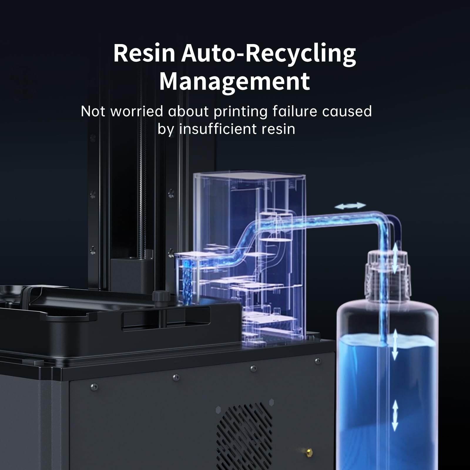 - 【Intelligent Resin Management】Resin Vat with Temperature Control improves the resin quality and printing success rate. The automatic material management system monitors the resin level and adds resin as required, minimizing waste.