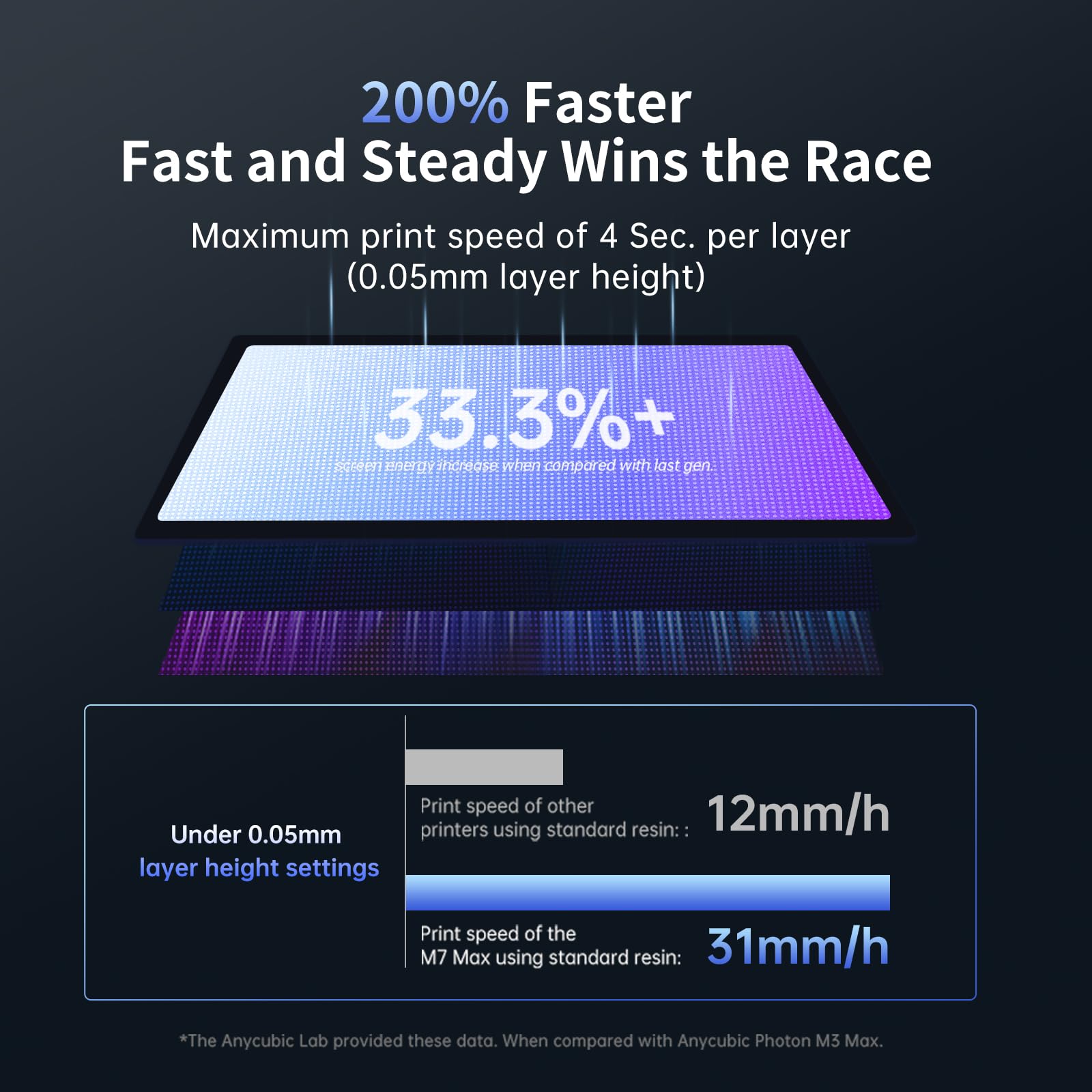 - 【Faster Printing Speed】Thanks to the new technologies such as Intelligent Release 2.0 and dynamic Light-off Compensation, the Photon Mono M7 MAX prints at speeds of up to 60mm/h, 200% faster than the Photon M3 Max