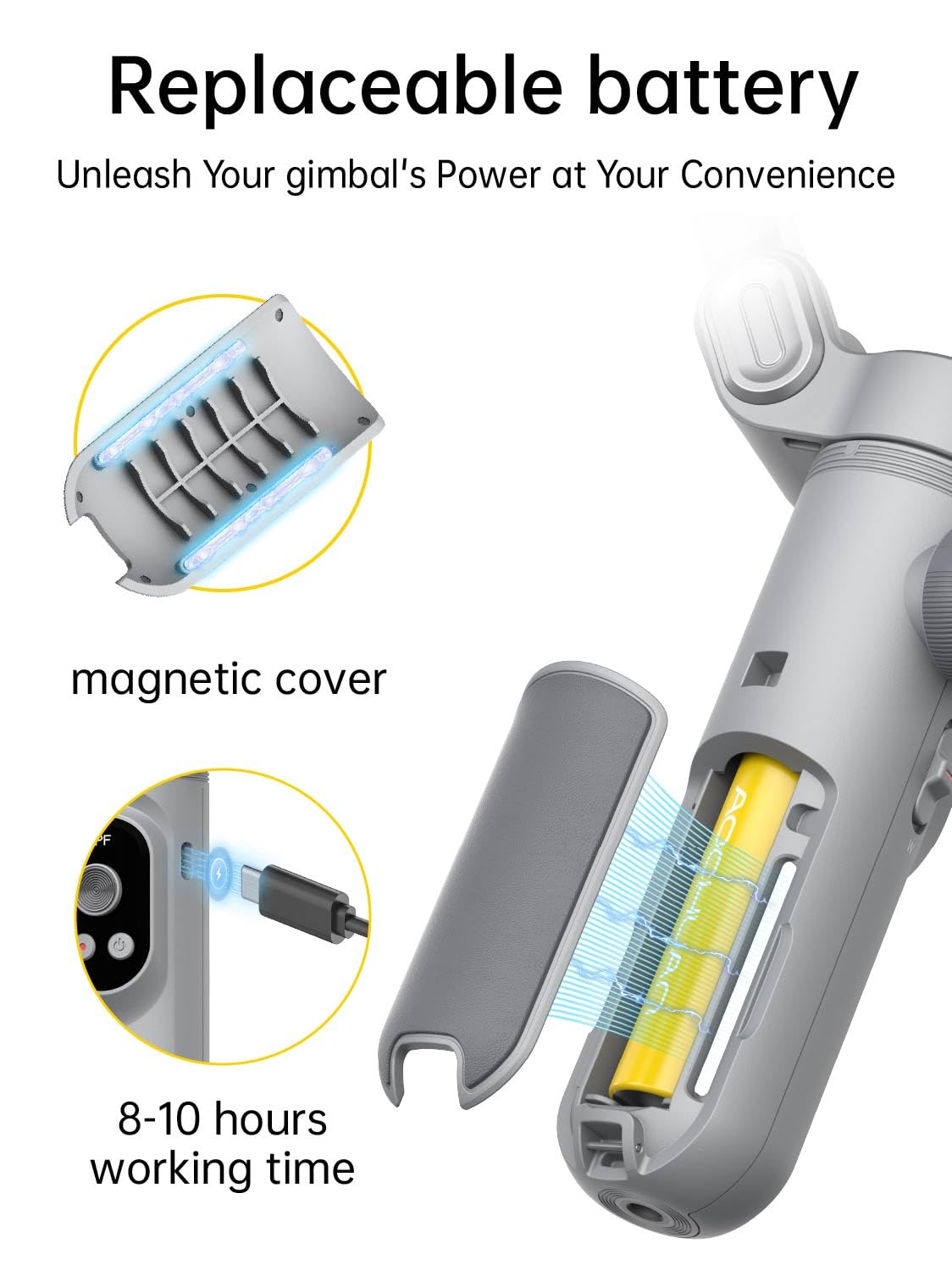 - Battery Flexibility and Wireless Charging: The gimbal features a powerful built-in 3200 mAh lithium-ion battery, providing a standby time of 8-10 hours and the battery is removable, capture every moment without worry about running out of power, ensuring an extended filming session for your creative endeavors. In addition, Additionally, enjoy the convenience of wireless charging, charge your phone at any time and ensuring that your gimbal is always ready for action
