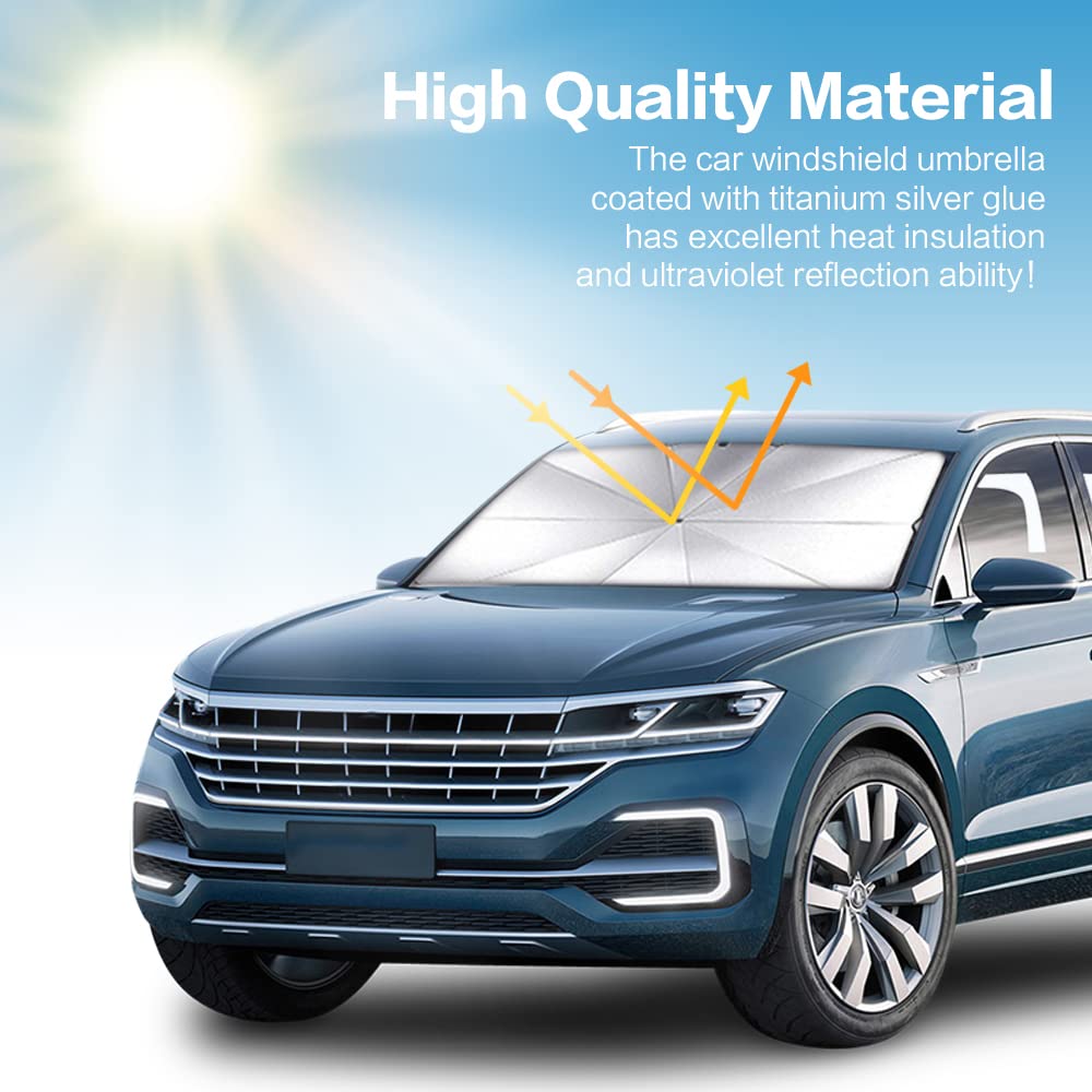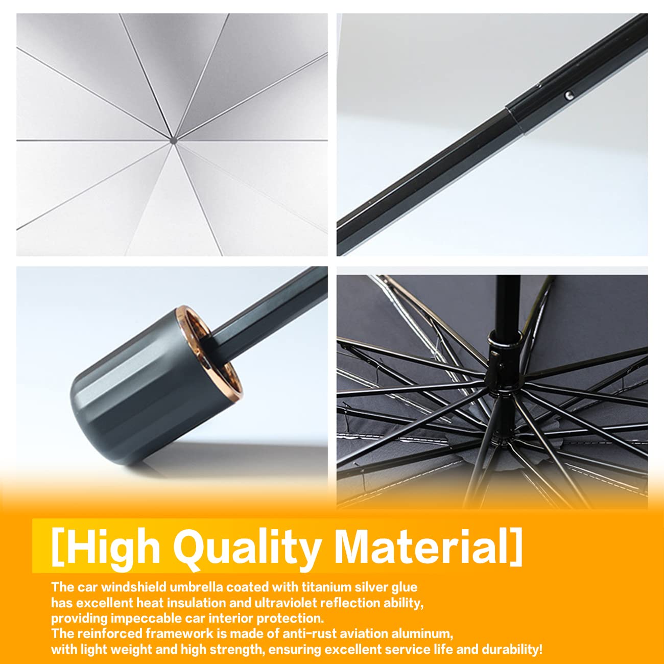 - [High Quality Material] The car windshield umbrella coated with titanium silver glue has excellent heat insulation and ultraviolet reflection ability, providing impeccable car interior protection. The reinforced framework is made of anti-rust aviation aluminum, with light weight and high strength, ensuring excellent service life and durability!