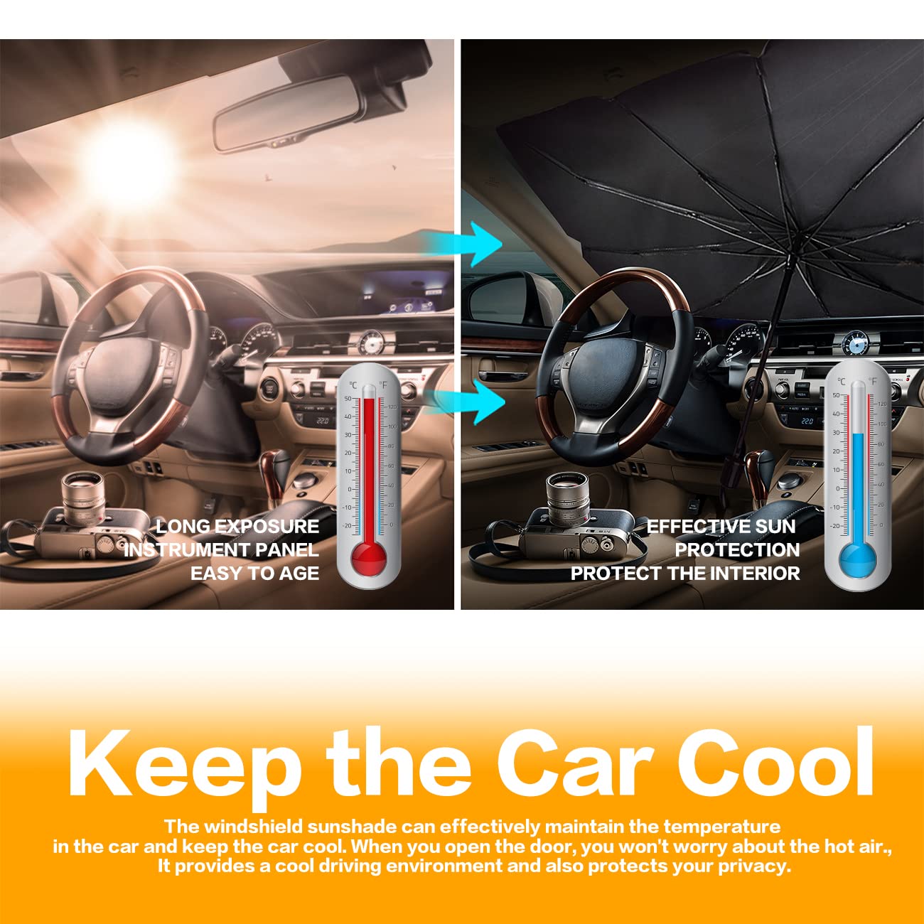 - [Keep the Car Cool] The windshield sunshade can effectively maintain the temperature in the car and keep the car cool. When you open the door, you won't worry about the hot air., It provides a cool driving environment and also protects your privacy.