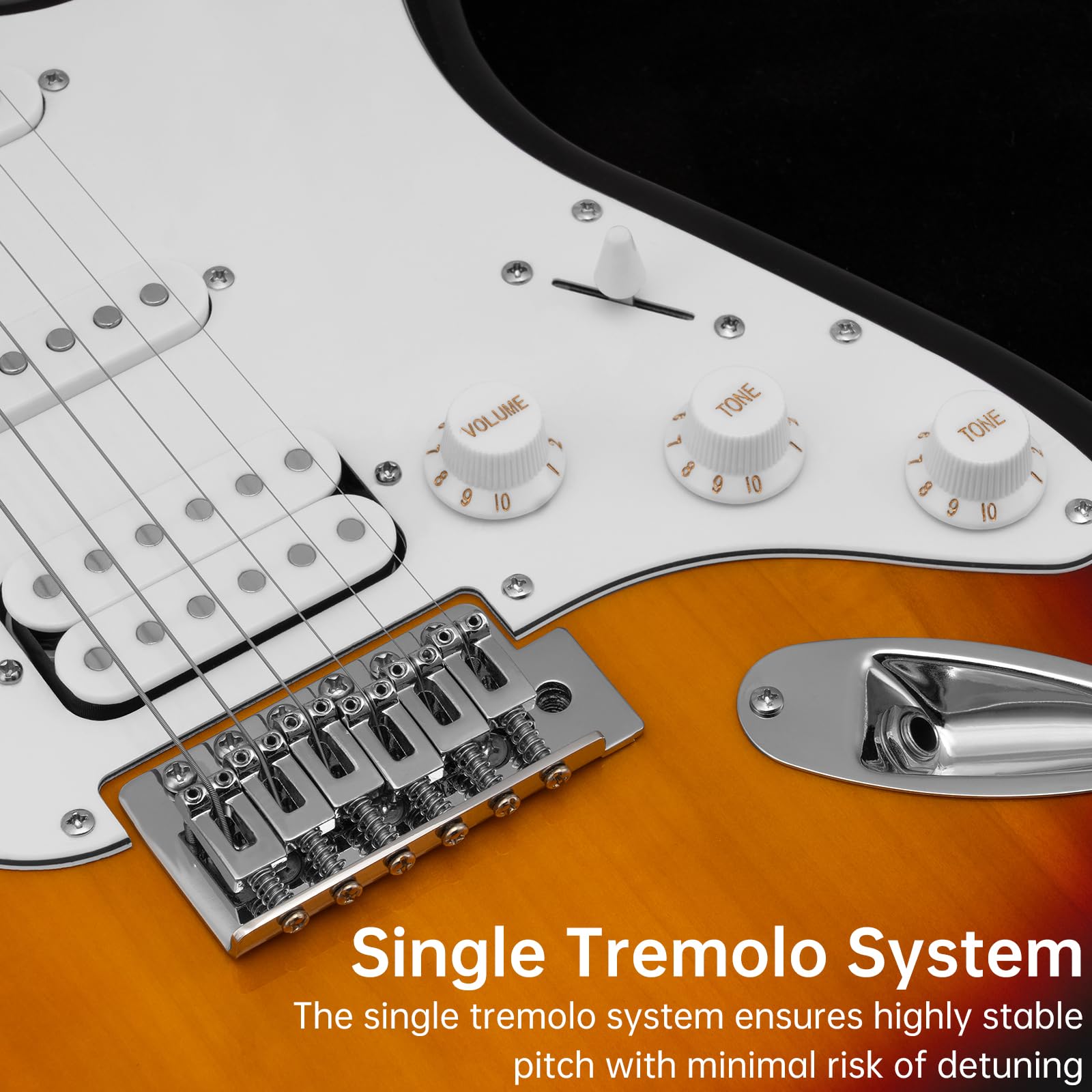 - [Quality Materials]: Custom-designed and handcrafted laurel fingerboard and birch neck. It translates vibrations into the rich, classic tones in the guitar through 3 pickups. The design of the C -type neck is more comfortable. The tremolo bridge system allows you to bend the pitch while playing, and the detachable tremolo arm produces a tremolo effect. Overall dimensions: 46.45*14.96*3.14 inches