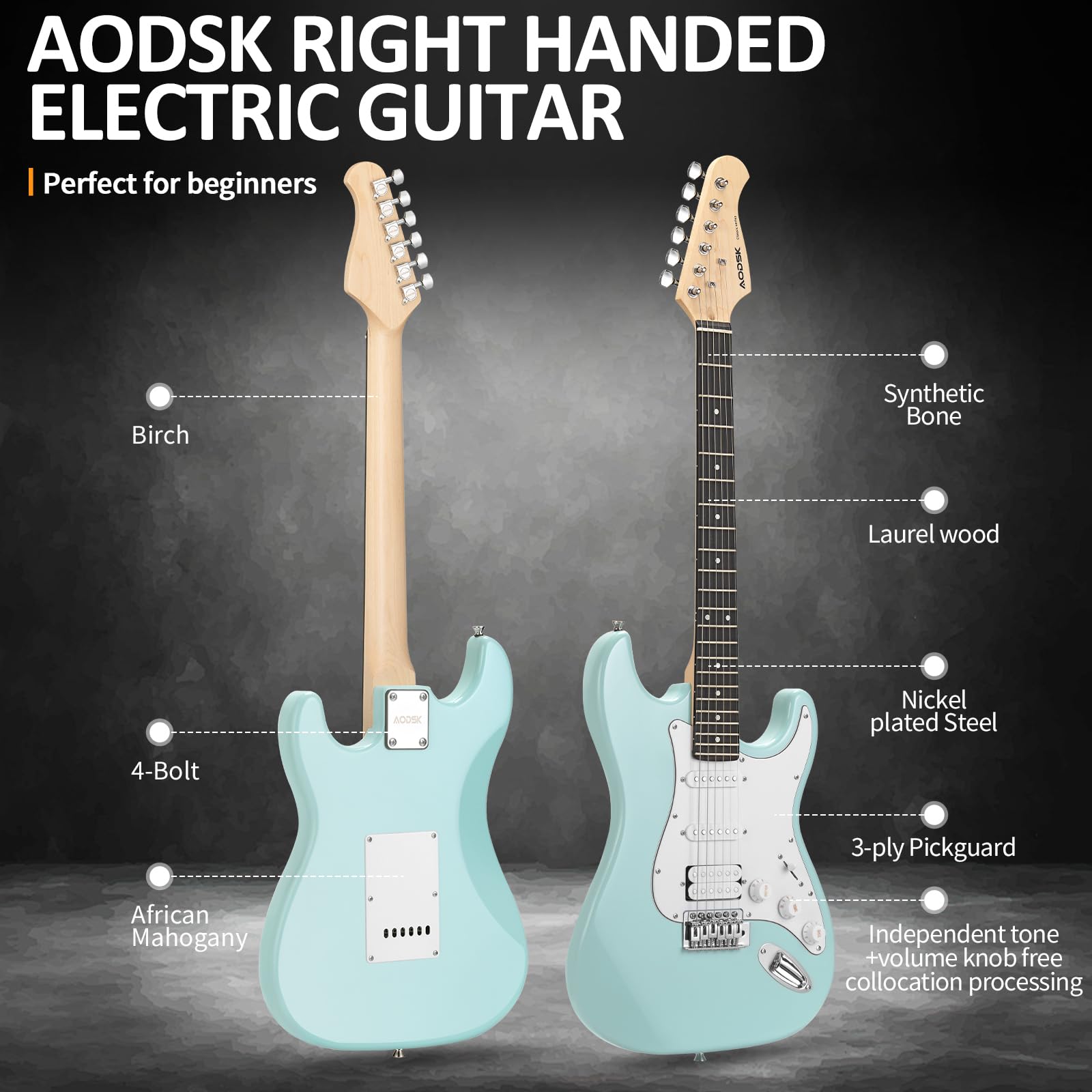 AODSK Electric Guitar with Amp Beginner Kit 39 Inch Solid Body Full Size,All Accessories,Digital Tuner,Six Strings,Four Picks,Tremolo Bar,Strap,Gig Bag,Starter kit (Blue-HSS)