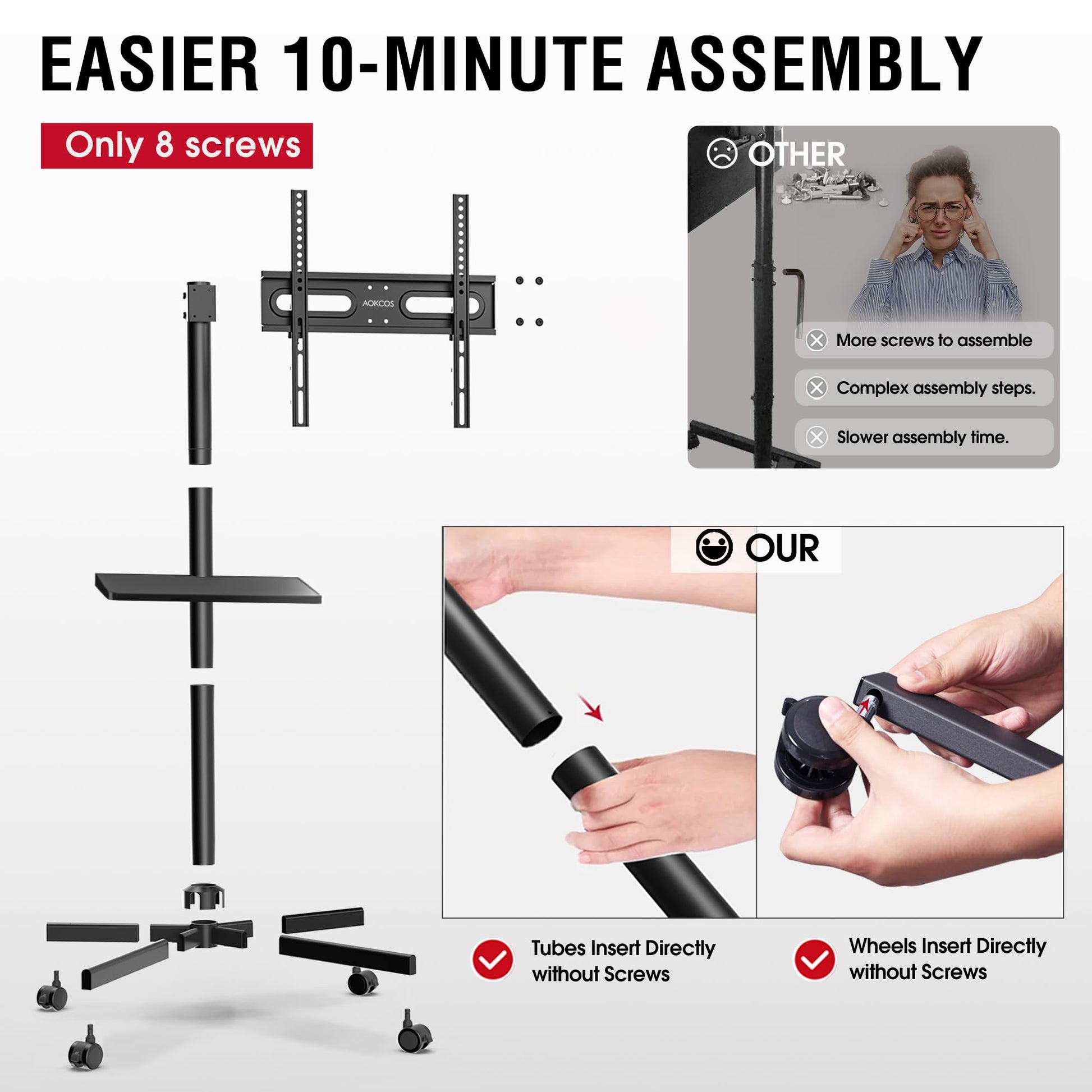 - 10-Minute Easy Installation: In order to solve the common problem of difficult installation, we have developed this super easy to install rolling TV stand, you do not need to face a bunch of different models of accessories, referring to our detailed installation instructions, just a few simple screws can be quickly completed in 10 minutes