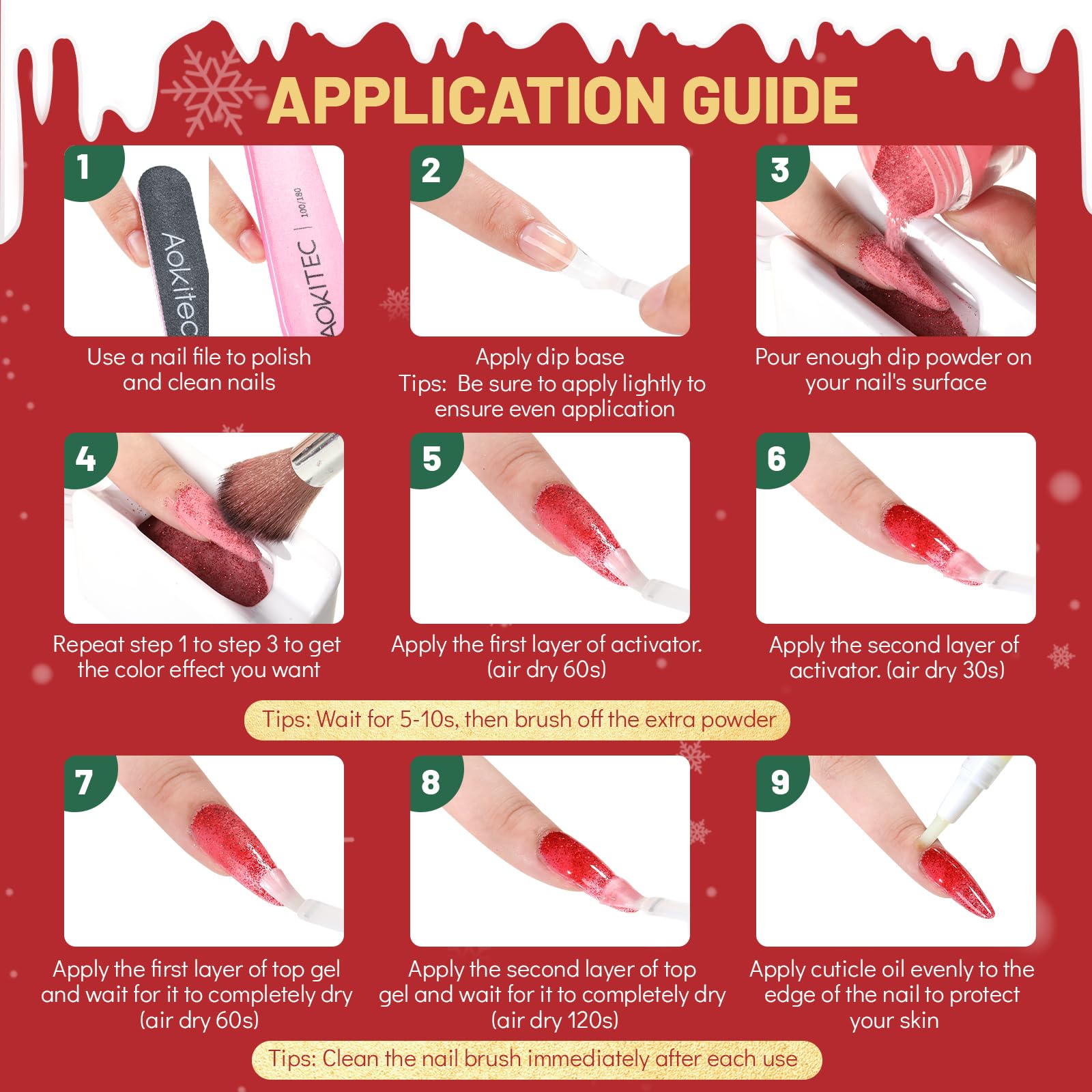 - š Versatile Finishes & Easy Application - Aokitec dip powder nail selection boasts a wide range of colors and finishes, from classic red & green shades to trendy new designs, allowing you to express your style and switch up your look effortlessly. Dip powder does not need nail lamp to cure, air-dry quickly, beginner-friendly, you can finish your new dip nails at home easily.