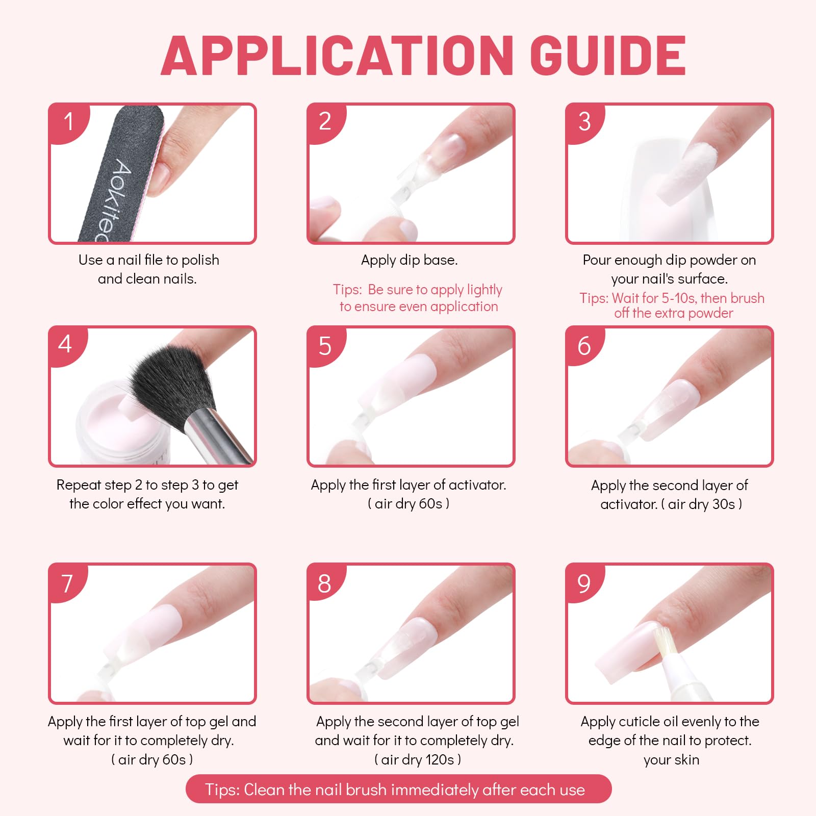 - ✨【EASY TO OPERATION】Aokitec Dip powder should be used with top, base coat and activator, Apply it in right way,it can last more than 7 weeks. Don't waste money on nail salon anymore.Doesn’t need nail lamp to cure, which can avoid to damage your skin. It's a faster way to paint your nails.