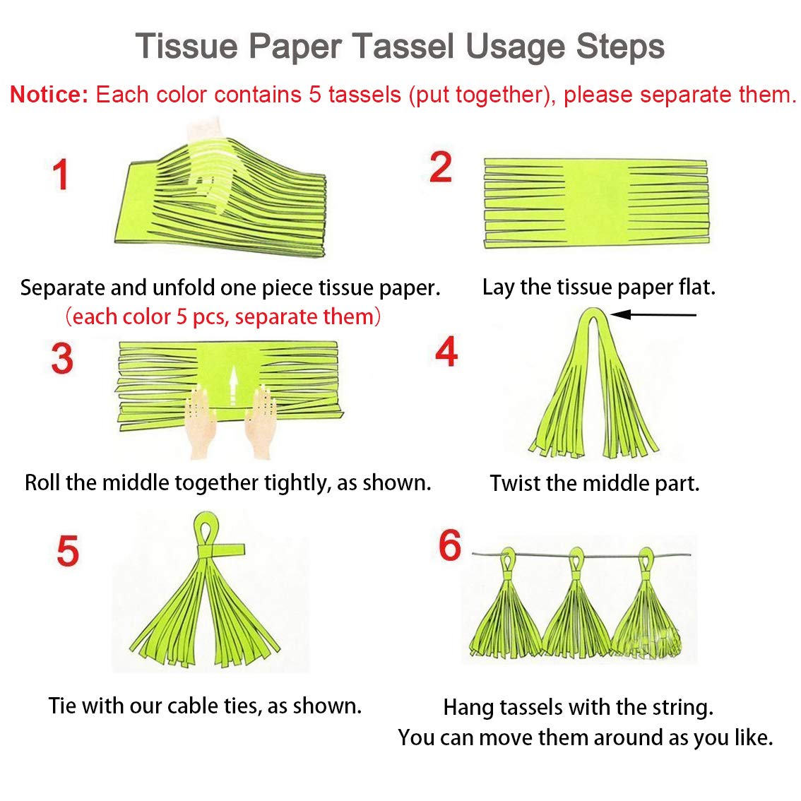 *Notice: 3 colorful tassels in the package, each color contains 5 tassels (put together), they are stacked neatly in piles of 5, please separate them and assemble by following the instructions, it is easy.